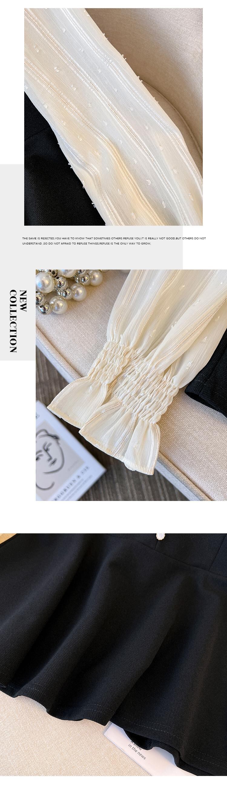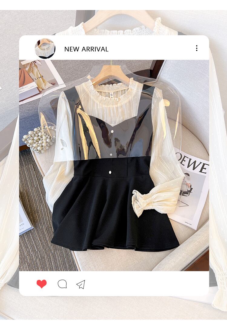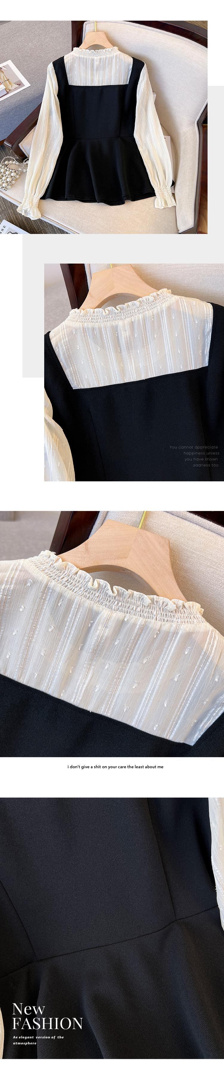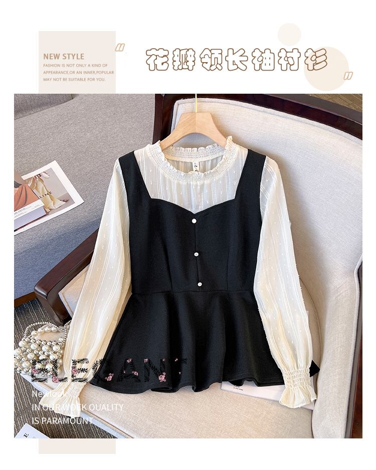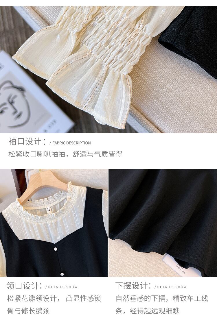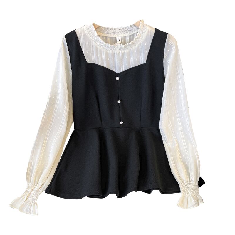 大きいサイズの婦人服 2023 春服脂肪姉妹新しい木製耳側コントラスト カラー スプライシング偽ツーピース スリム腹カバー トップ 大きめサイズ スプリング 春物 8884114379397858