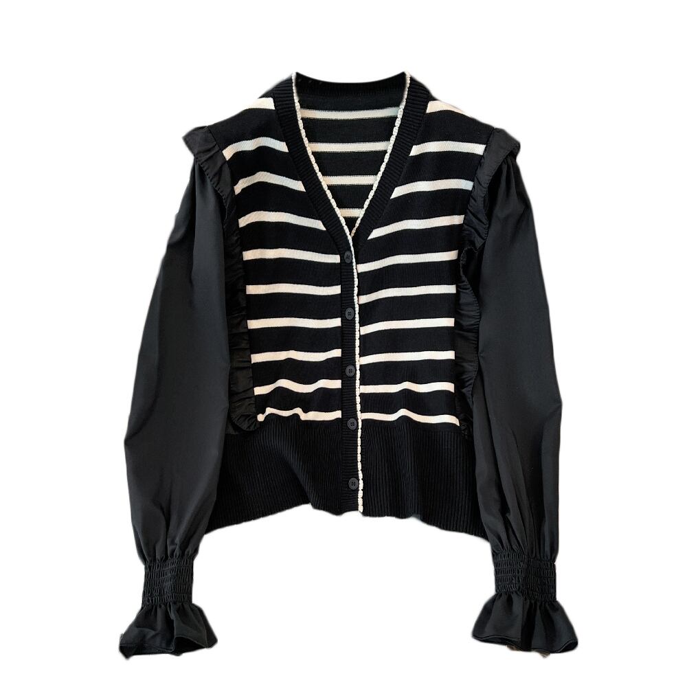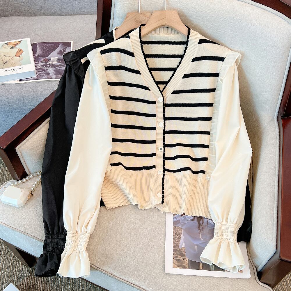 大きいサイズの婦人服 2023 春の新しいファット シスター ファッション年齢を減らすフェイク ツーピース V ネック ストライプ カジュアル セーター 大きめサイズ スプリング 春物 Vネック 8884157992165190
