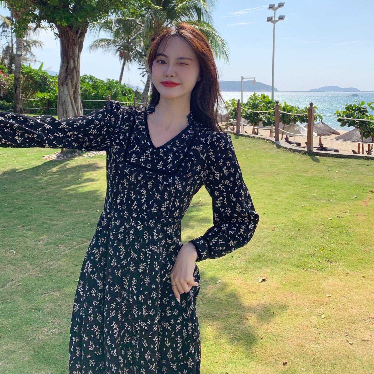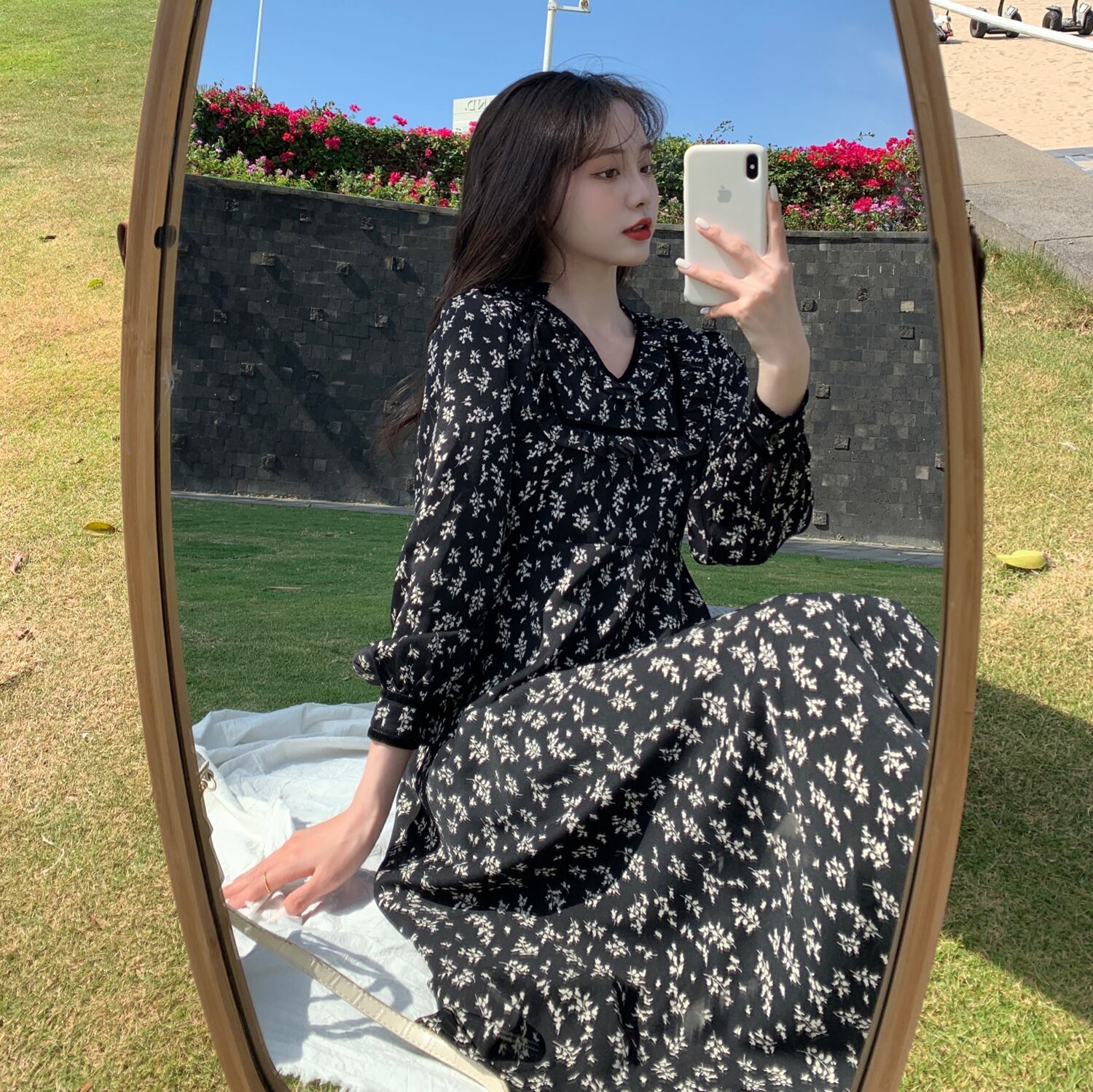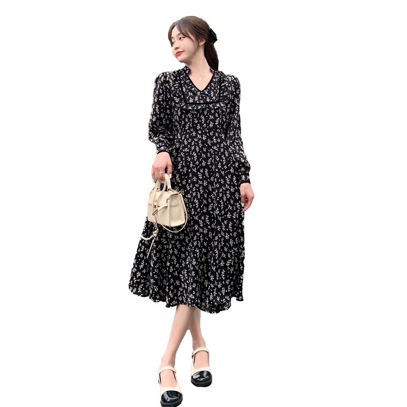 プラスサイズの婦人服 2023 春服ファットシスターズ新ヘップバーンスタイル v ネックハイウエストロングスカート黒花柄ドレス ハイウェスト ブラック 大きめサイズ スプリング 春物 Vネック 8884120192913120