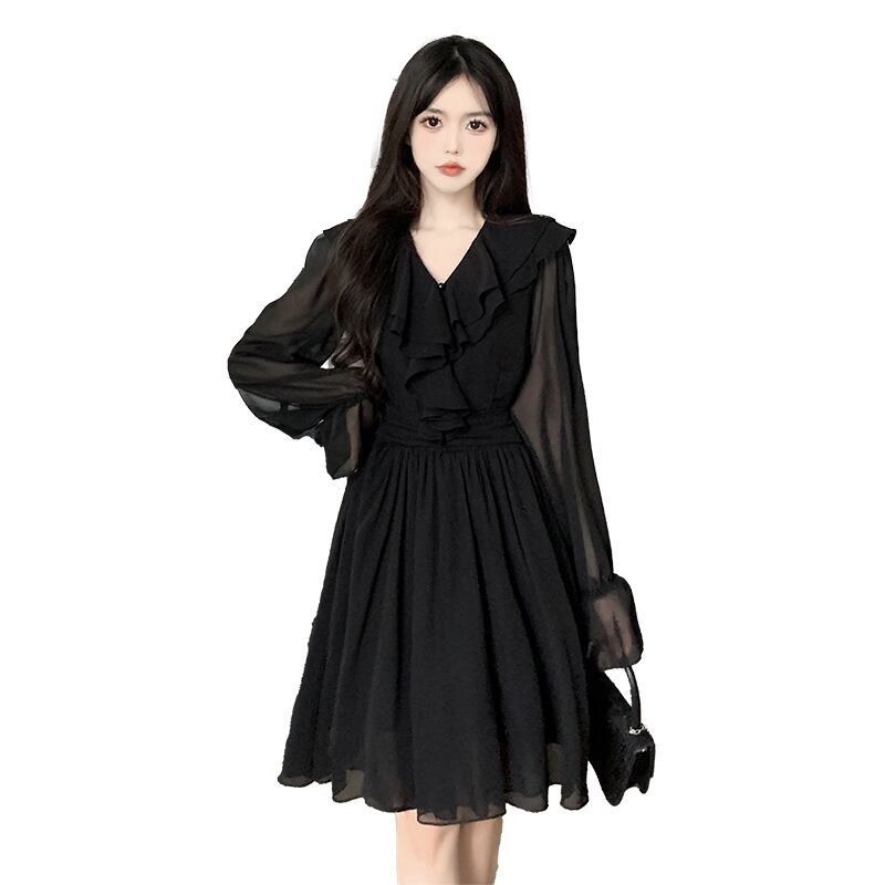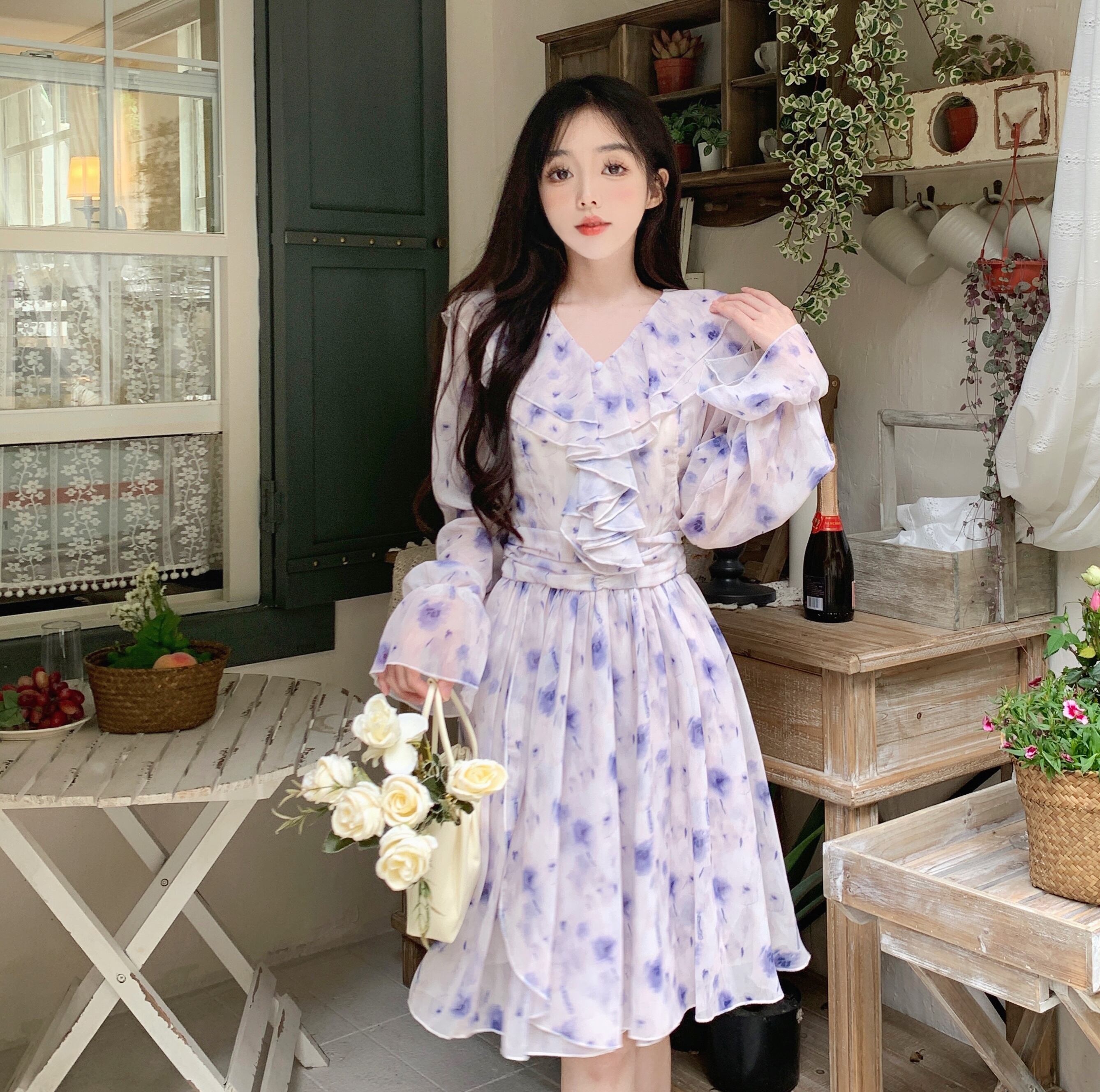 大きいサイズの婦人服 2023 春服脂肪姉妹新しい細いウエスト V ネック花柄長袖フリル ドレス ロング 大きめサイズ スプリング 春物 Vネック 8884176195082836