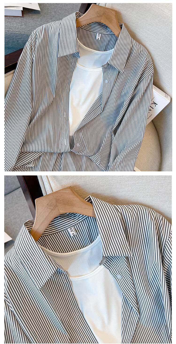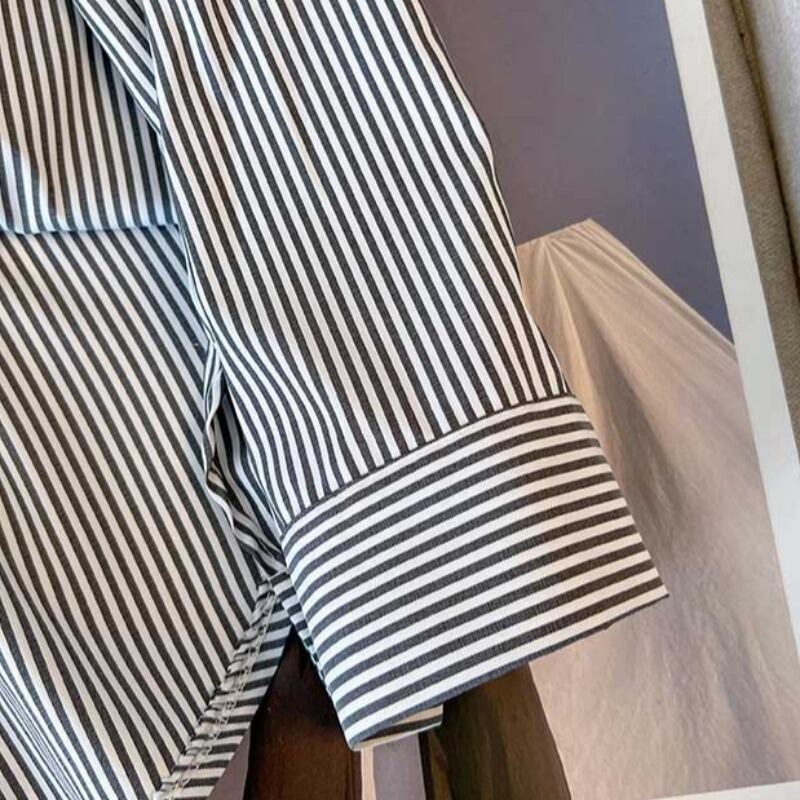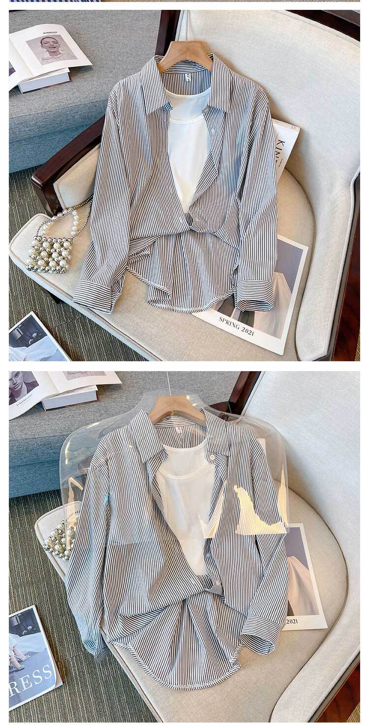 プラスサイズの婦人服 2023 春の新しいファットシスターオールマッチフェイクツーピースデザインストライプ気質年齢引き下げシャツ 大きめサイズ スプリング 春物 8884157773364732