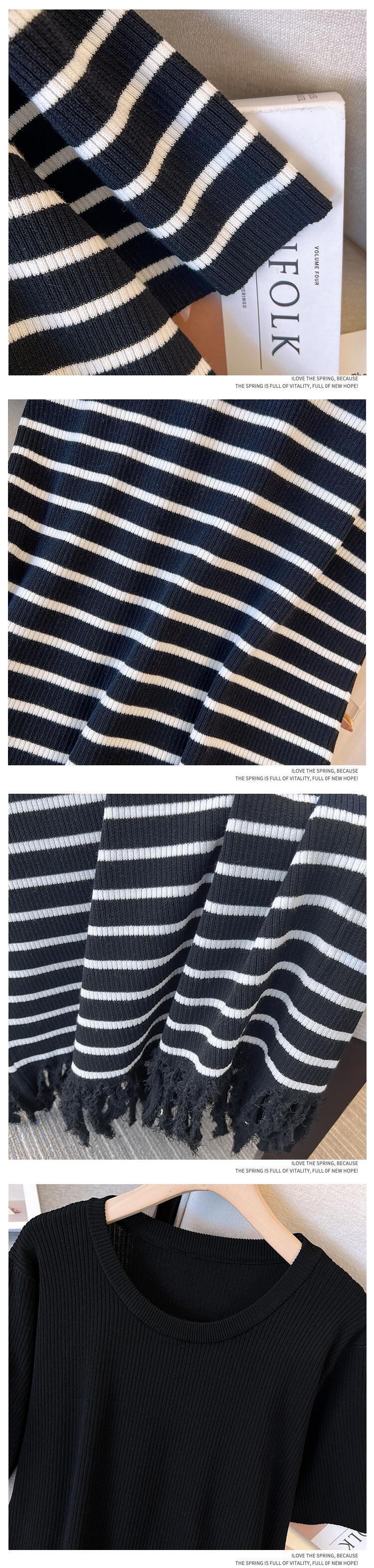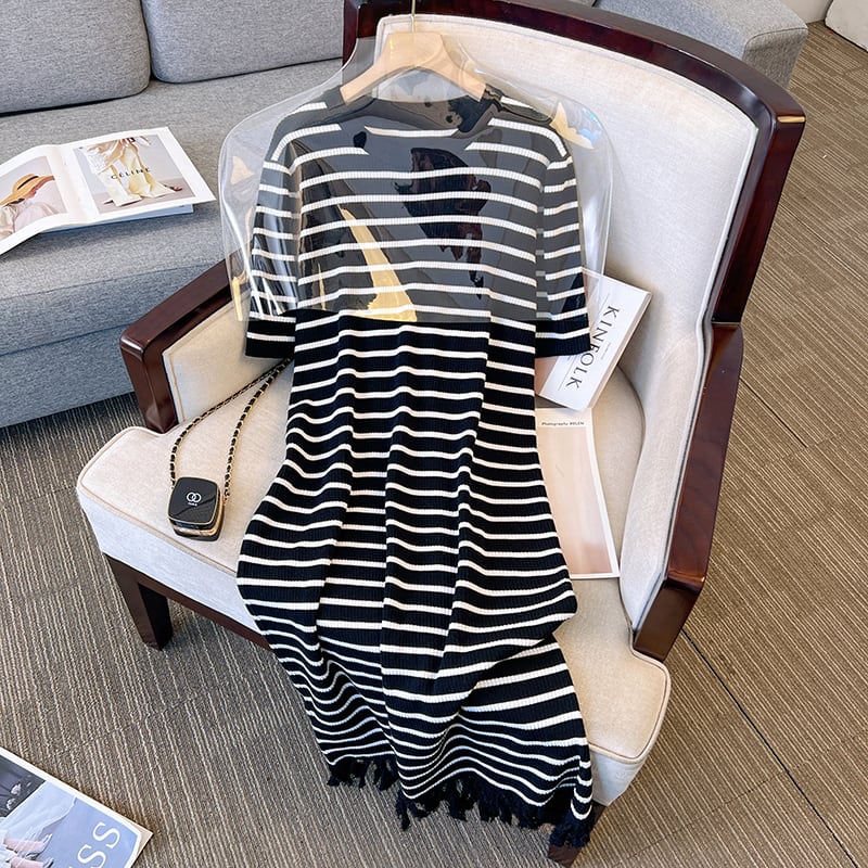 大きいサイズの婦人服 2023 新しい夏服ファットシスターズゆるくて薄いアイスシルクストライプニット半袖ドレス女性 大きめサイズ サマー 夏物 8884175944906766