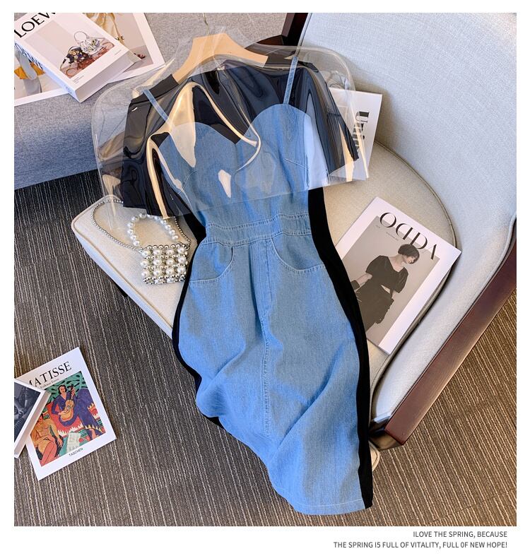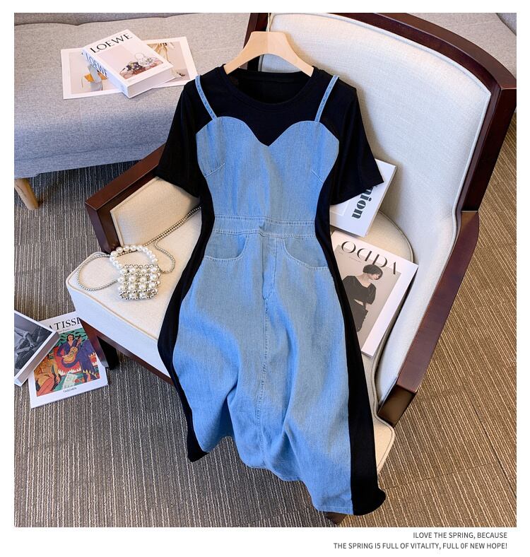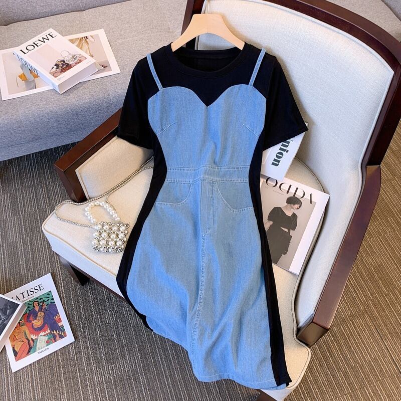 プラスサイズの婦人服 2023 夏の新しいファットシスターファッションフェイクツーピースデザインセンスウエストフレンチドレス女性 大きめサイズ サマー 夏物 8884136742332181