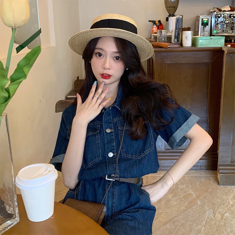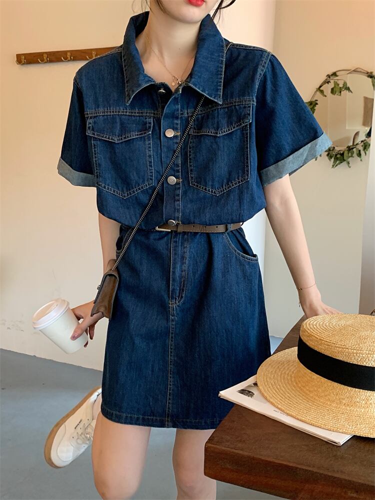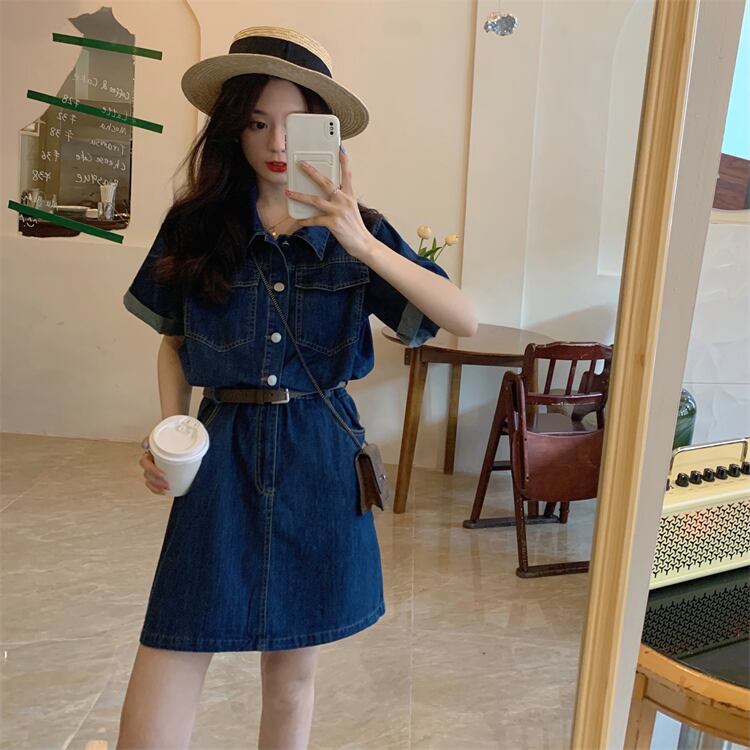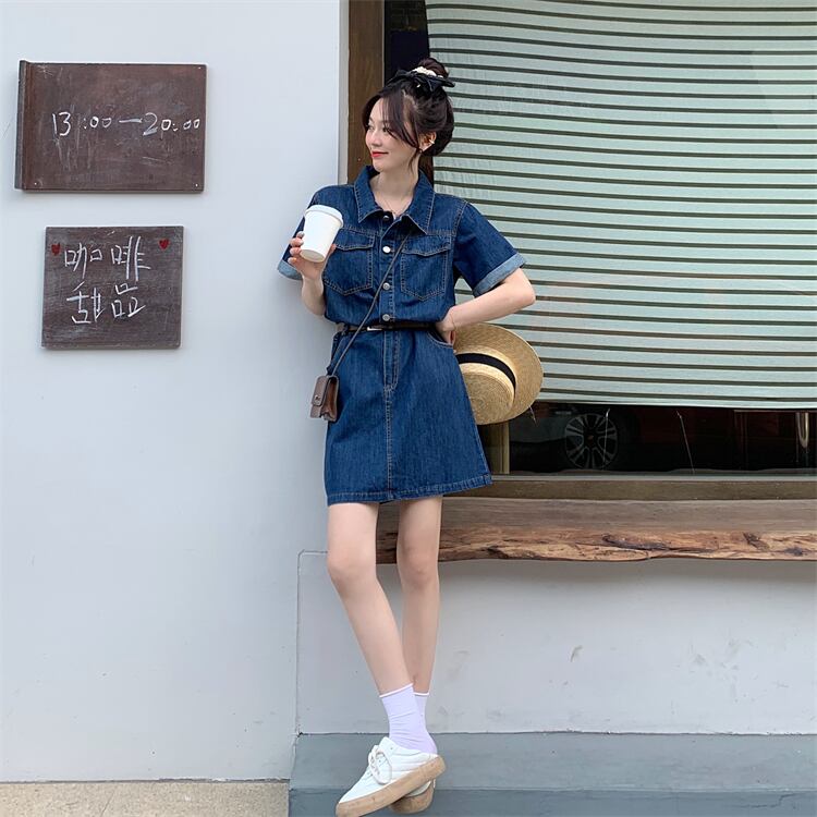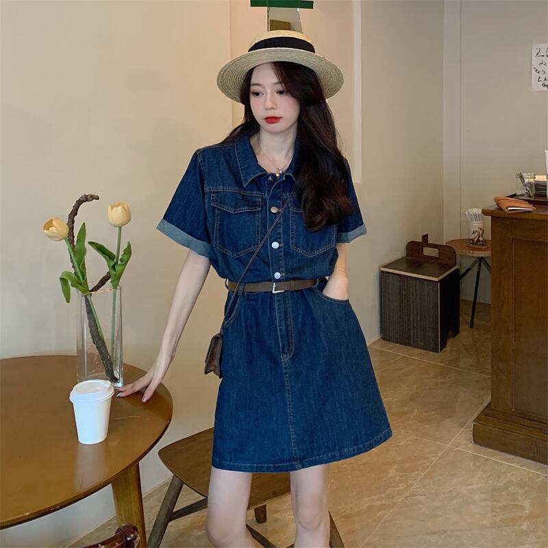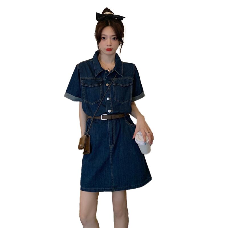 プラスサイズの婦人服2023ファットシスター夏の新しいレトロなミッドレングスの半袖デニムドレスの女性のベルト 大きめサイズ サマー 夏物 ハーネス 8884194892759060