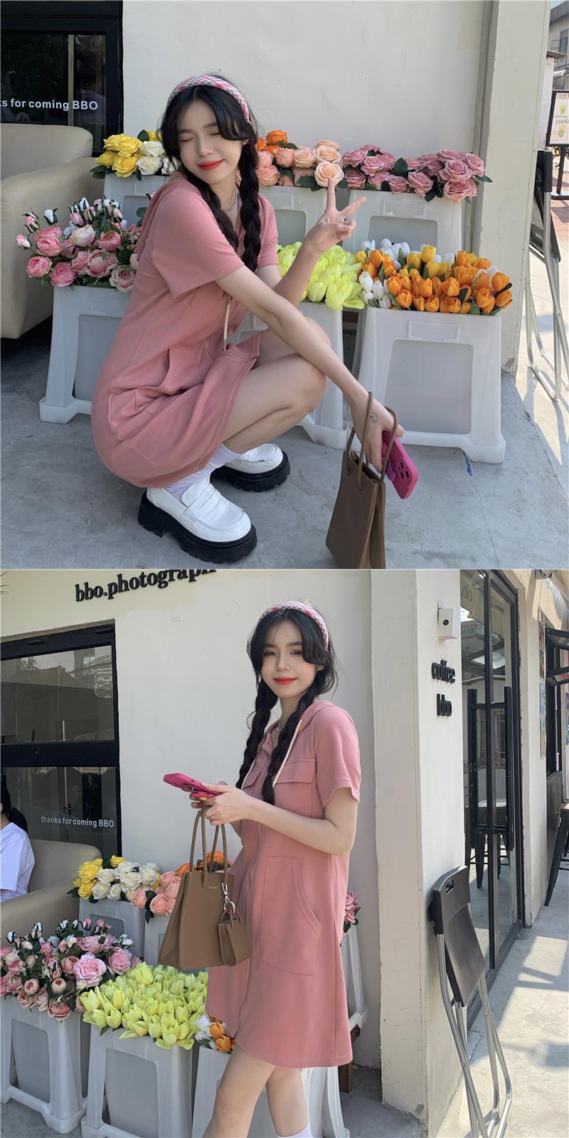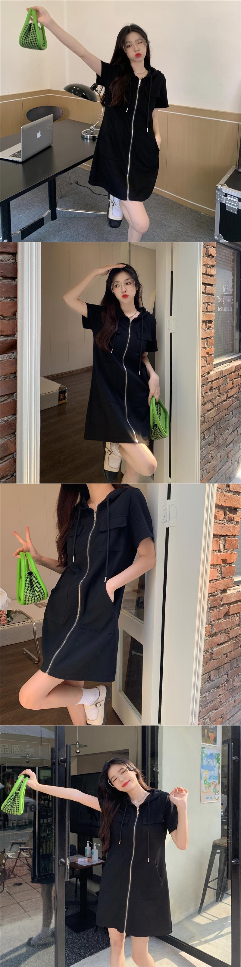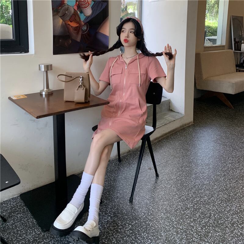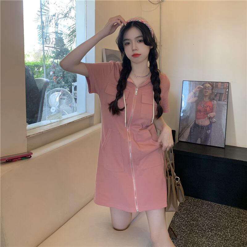 プラスサイズの婦人服 2023 トレンディな女性の夏の新しいスタイルのファットシスタールーズで薄いカジュアルなスタイルの半袖フード付きジッパードレス 大きめサイズ サマー 夏物 8884165291640804
