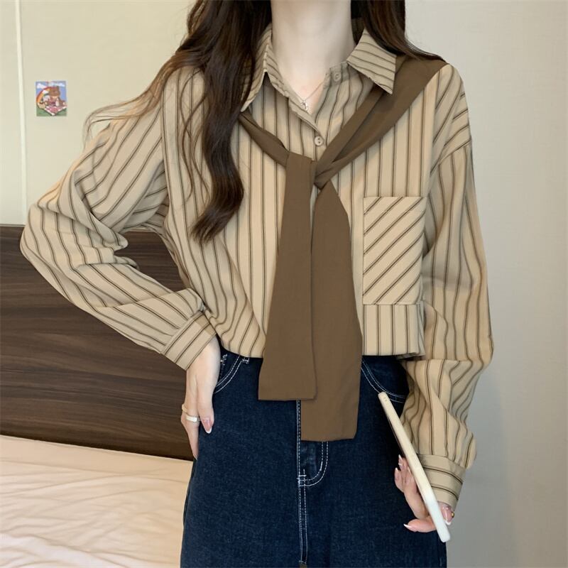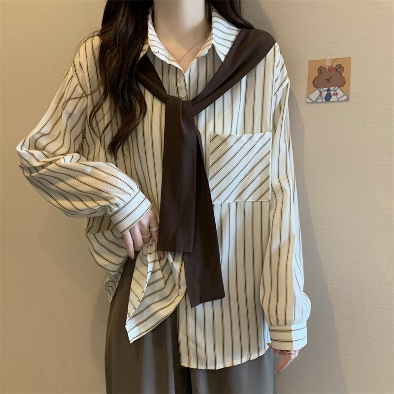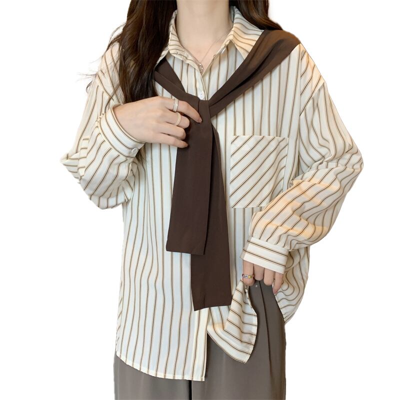 大きいサイズの婦人服 2023 春服脂肪姉妹新バージョンスリムストライプルーズショールフェイクツーピースシャツ女性 大きめサイズ スプリング 春物 8884166147831598