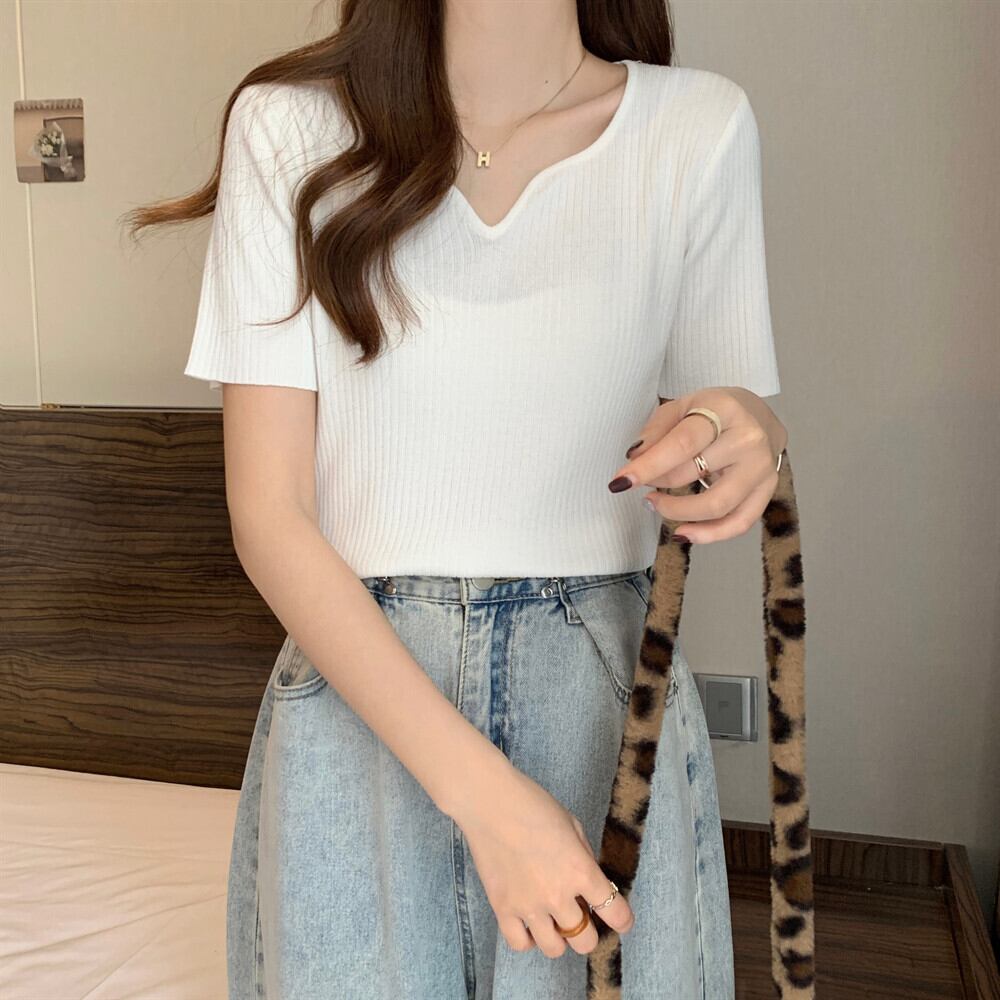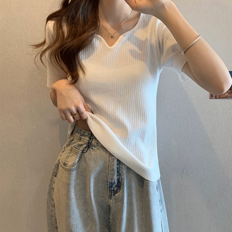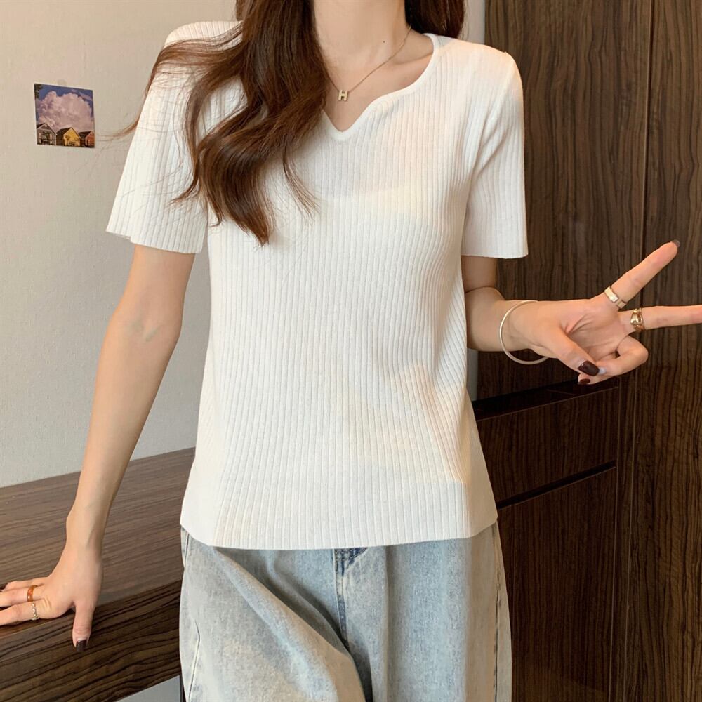 プラスサイズの婦人服 2023 夏の新しいデザイン脂肪姉妹フレンチ V ネック半袖トップス年齢を減らすアイス シルク シャツ T シャツ 大きめサイズ サマー 夏物 Vネック Tシャツ 8884154219159828