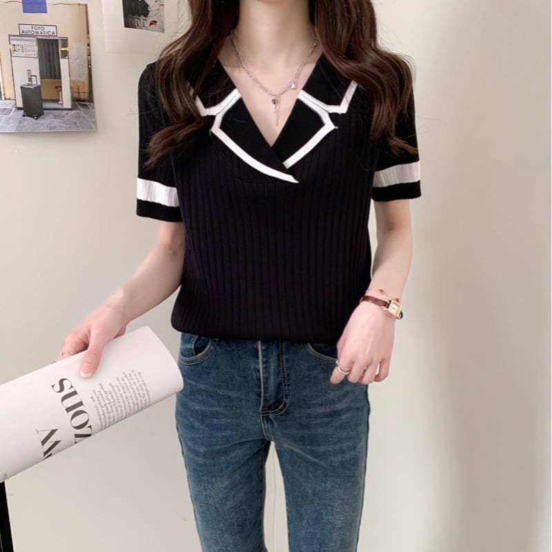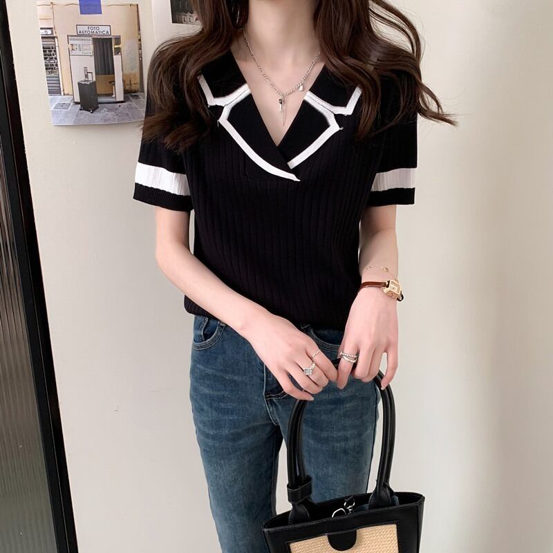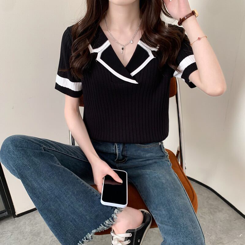 大きいサイズの婦人服 2023 トレンディな女性の夏の新しいファット シスター V ネック ニット ラペル半袖スリム T シャツ 大きめサイズ サマー 夏物 Vネック Tシャツ 8884166012147826