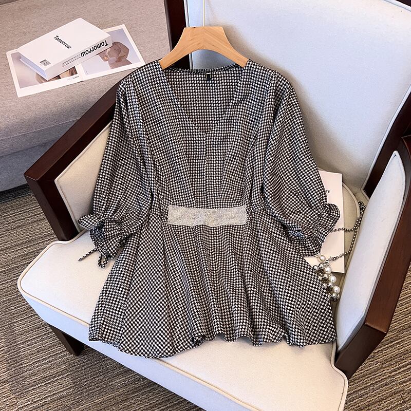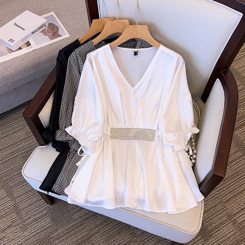 プラスサイズの婦人服 2023 脂肪姉妹夏の新ファッション緩い V ネックウエスト痩身シャツカジュアルトップ 大きめサイズ サマー 夏物 Vネック 8884111485814358