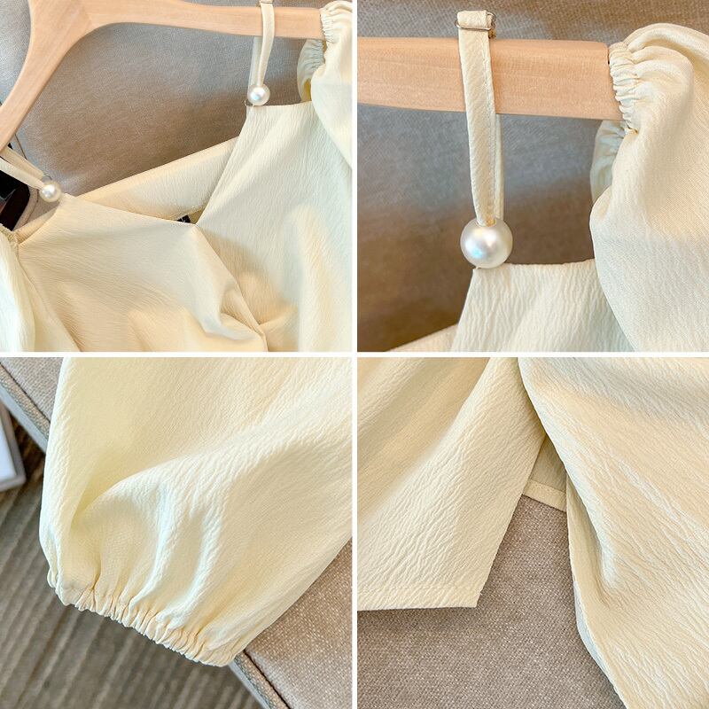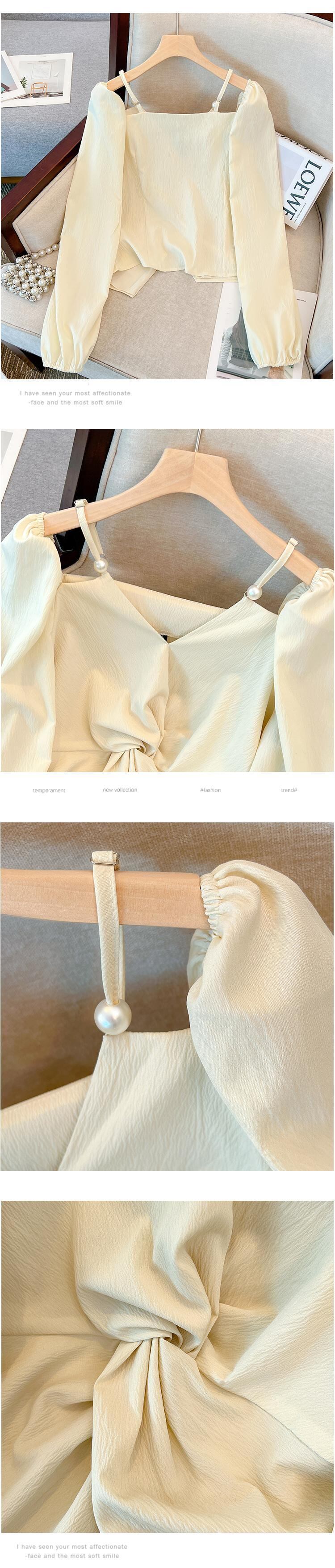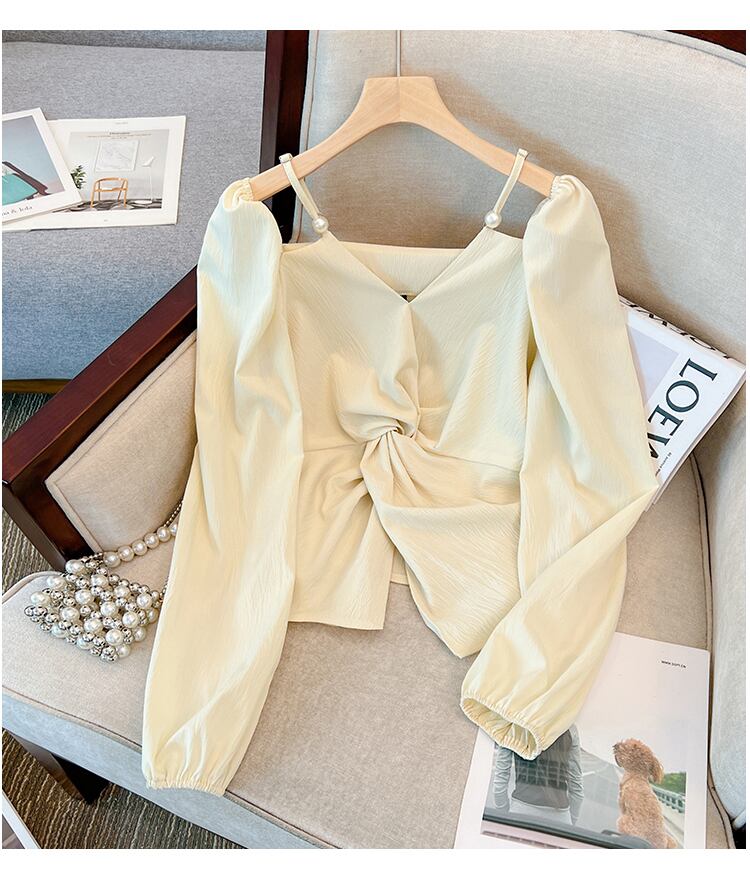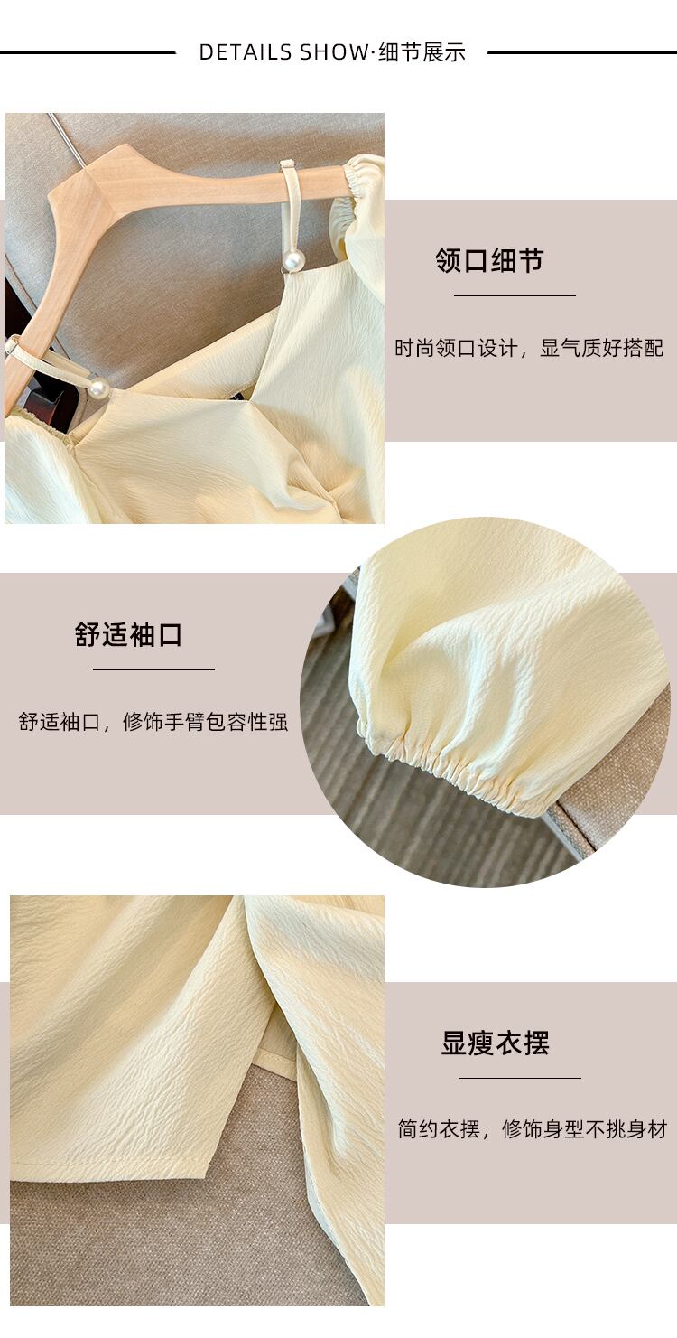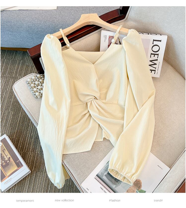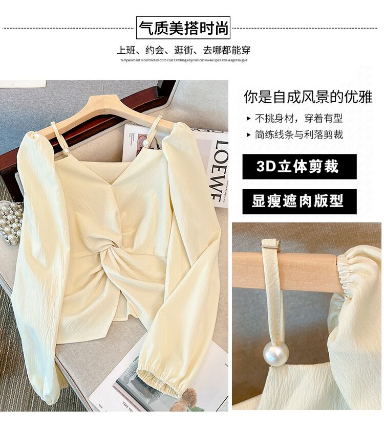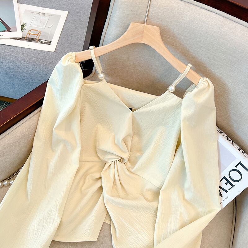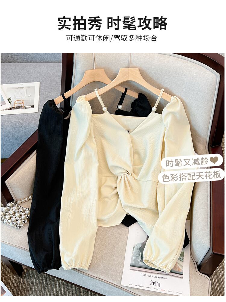 大きいサイズの婦人服2023年春服ファットシスターズ新デザインセンス長袖Vネック鎖骨オフショルダートップシフォンシャツ ロング 大きめサイズ スプリング 春物 8884130695995442
