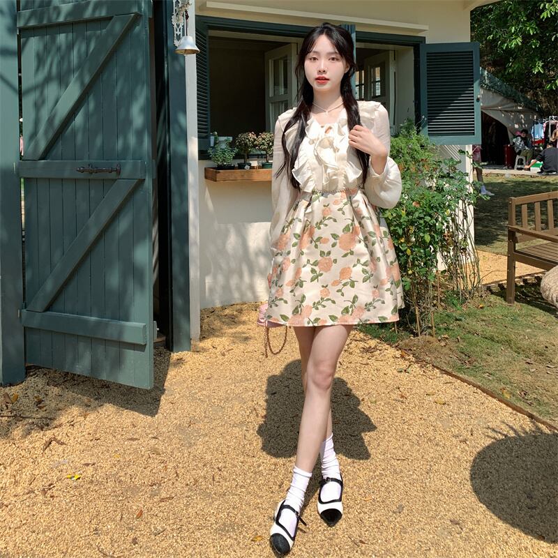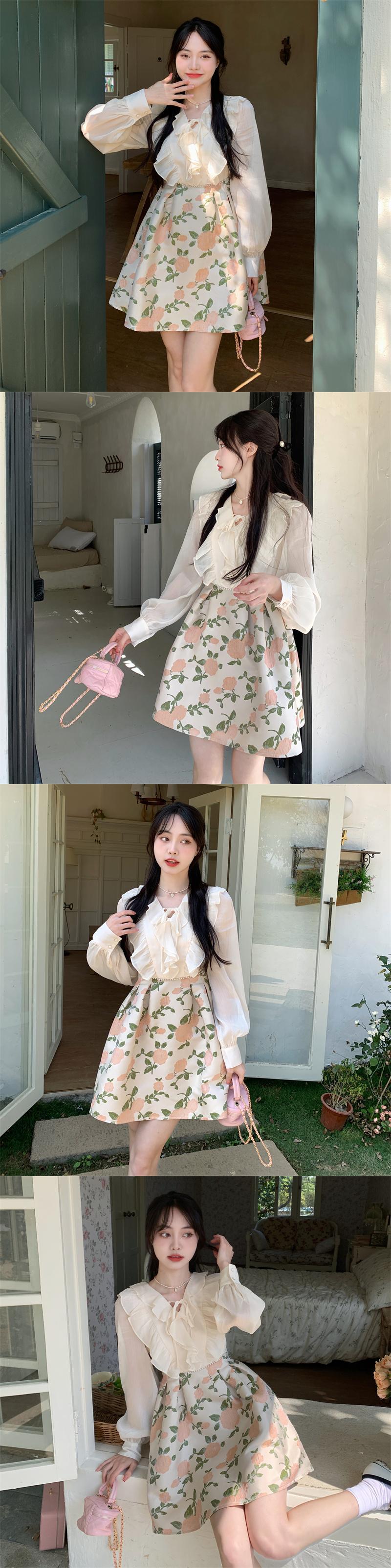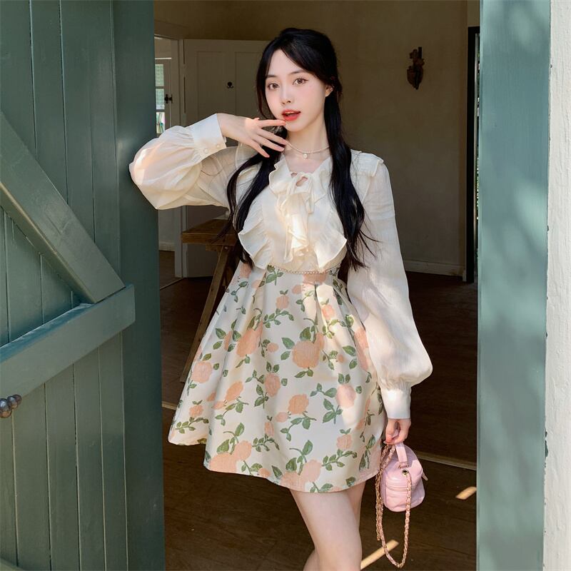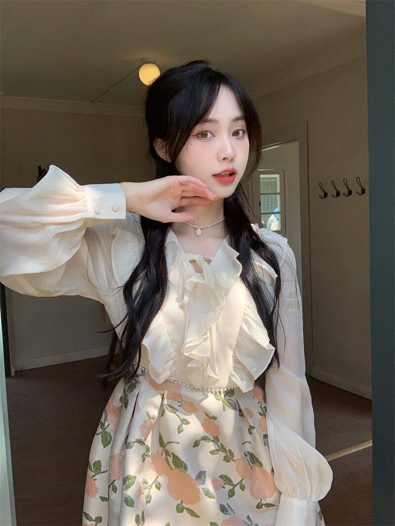 プラスサイズの婦人服 2023 春服脂肪姉妹新しいフレンチ スタイル フリル ハイウエスト長袖シフォン ジャカード ドレス ロング 大きめサイズ スプリング 春物 8884113869674739