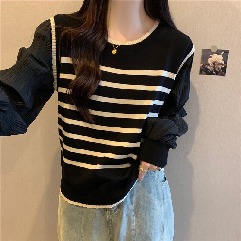 大きいサイズの婦人服 2023 トレンディな女性の春の新しいスタイルの太った姉妹は、フランスの気質のシフォン スプライシング フェイク ツーピース ニット セーターに見えます 大きめサイズ スプリング 春物 8884160763623308