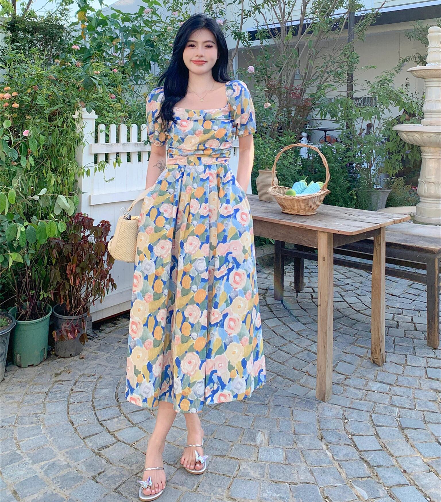 プラスサイズの婦人服 2023 脂肪姉妹夏の新ファッションスリムレトロドレス油絵パフスリーブホリデードレス 大きめサイズ サマー 夏物 8884177466723643