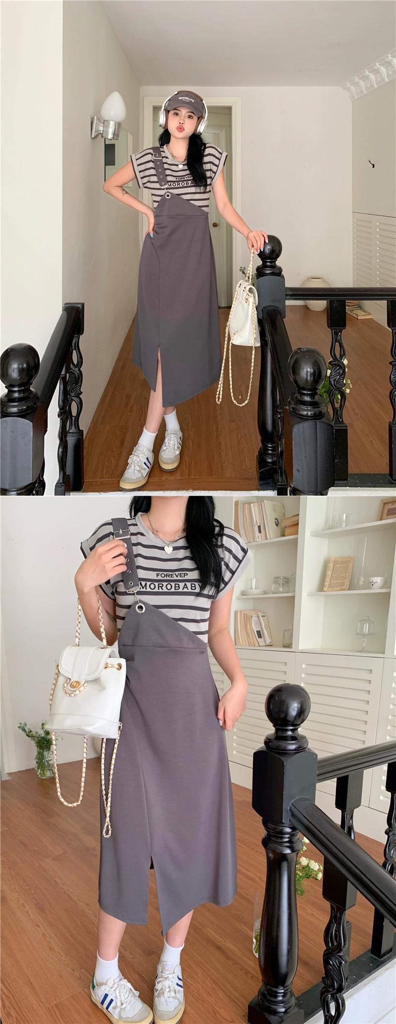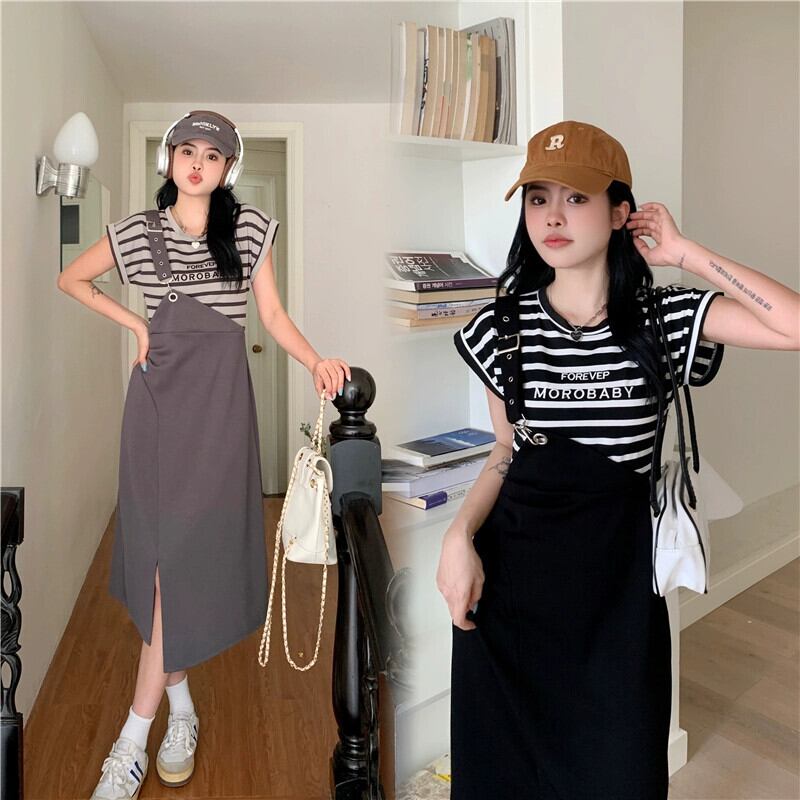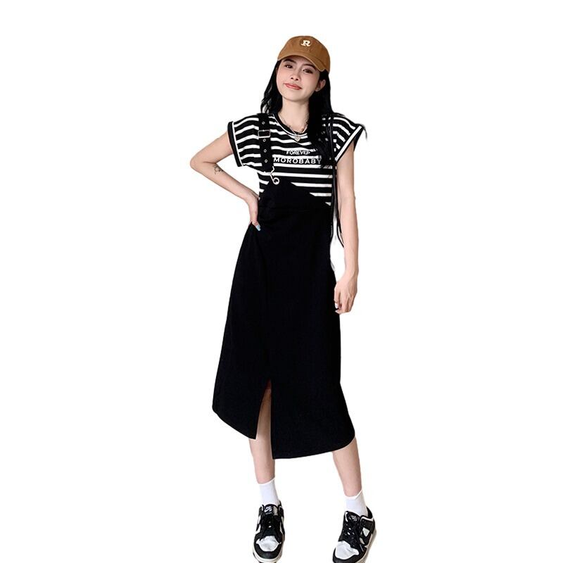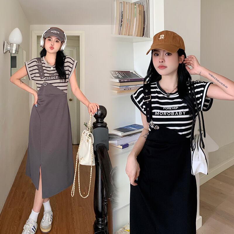 プラスサイズの婦人服 2023 夏服脂肪年齢軽減スプライシングストライプスリム A ラインスカートフェイクツーピースニッチドレス 大きめサイズ サマー 夏物 Aライン 8884163973859309