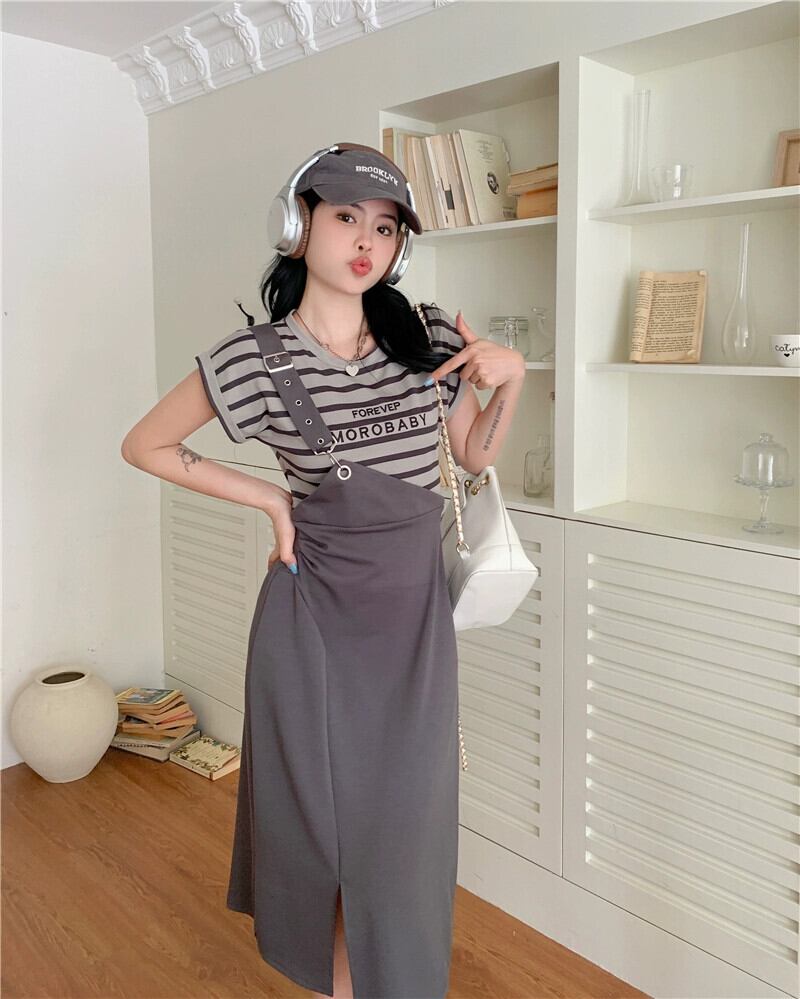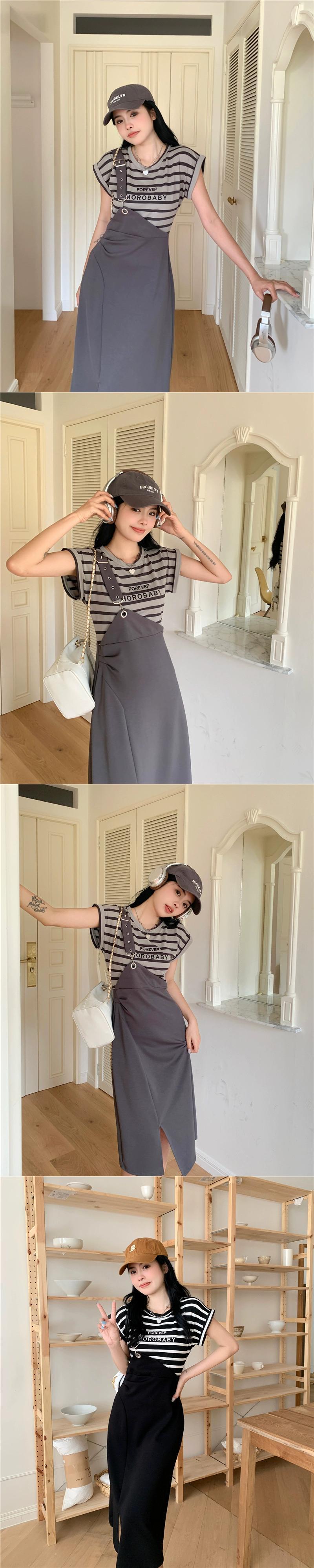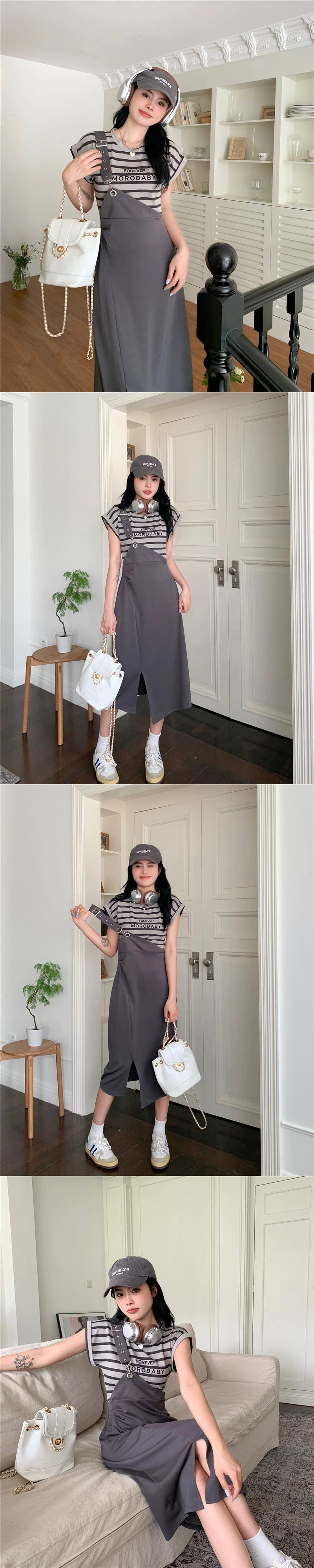 プラスサイズの婦人服 2023 夏服脂肪年齢軽減スプライシングストライプスリム A ラインスカートフェイクツーピースニッチドレス 大きめサイズ サマー 夏物 Aライン 8884163973859309