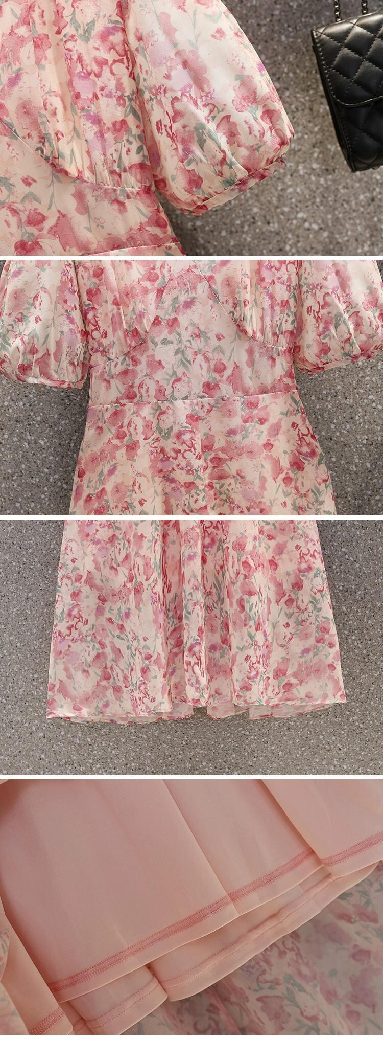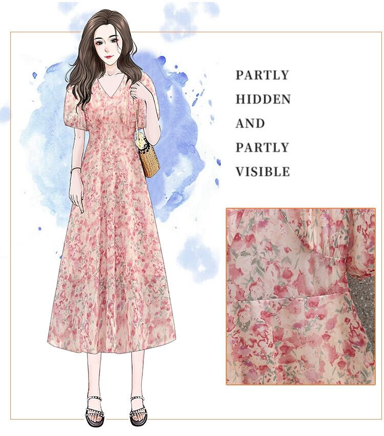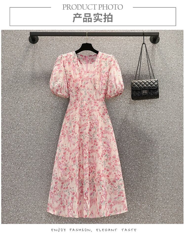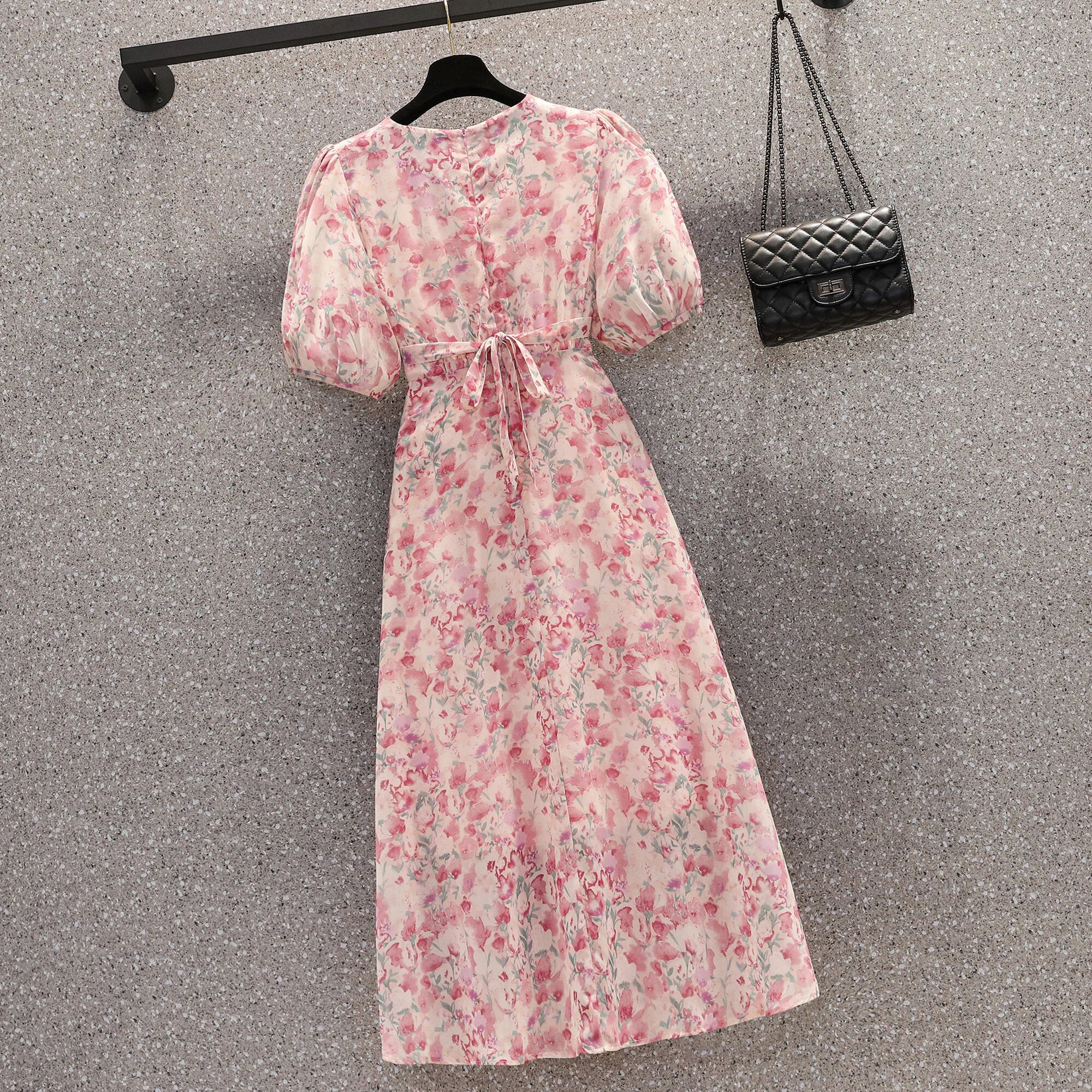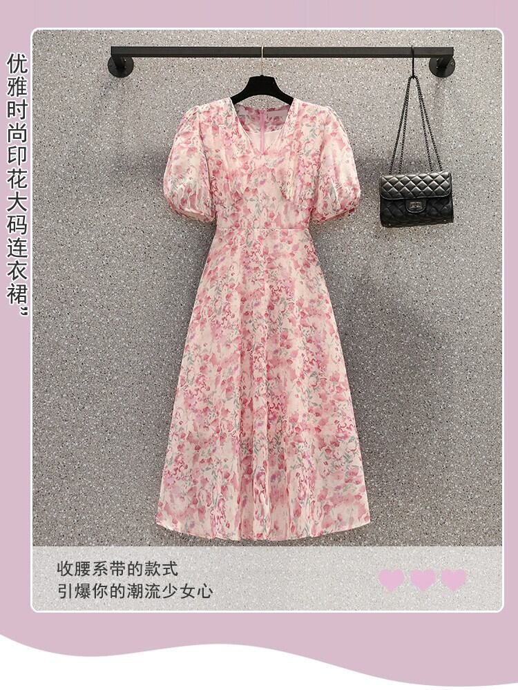 プラスサイズの婦人服 2023 脂肪姉妹夏の新フランス半袖薄い花柄ドレスロングスカートピンクシフォンドレス 大きめサイズ サマー 夏物 8884197327754111