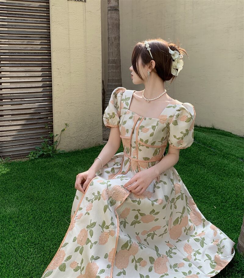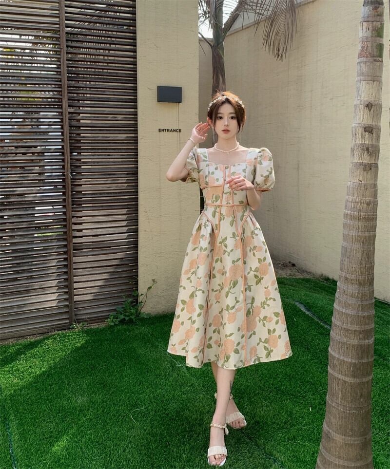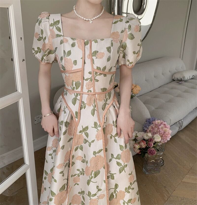 プラスサイズの婦人服 2023 脂肪姉妹夏新フレンチレトロティーブレイクスカート高品質スクエアカラーフラワードレス 大きめサイズ サマー 夏物 フラワーデザイン スクウェア 8884169557259191
