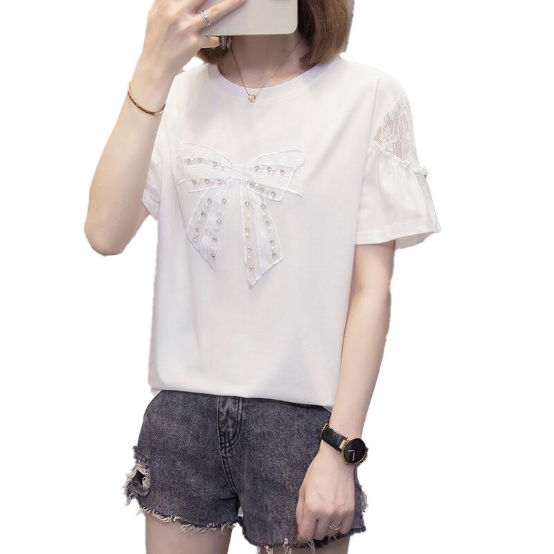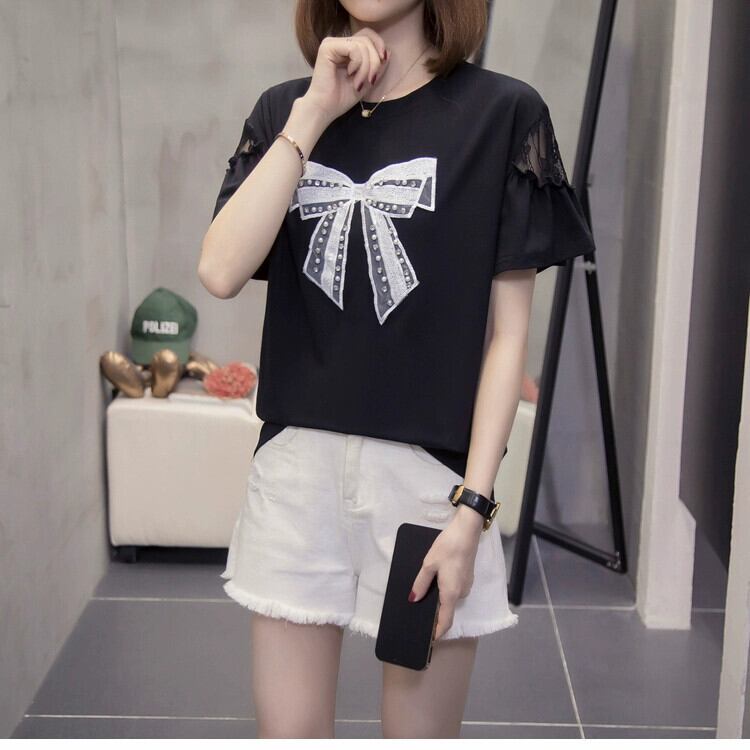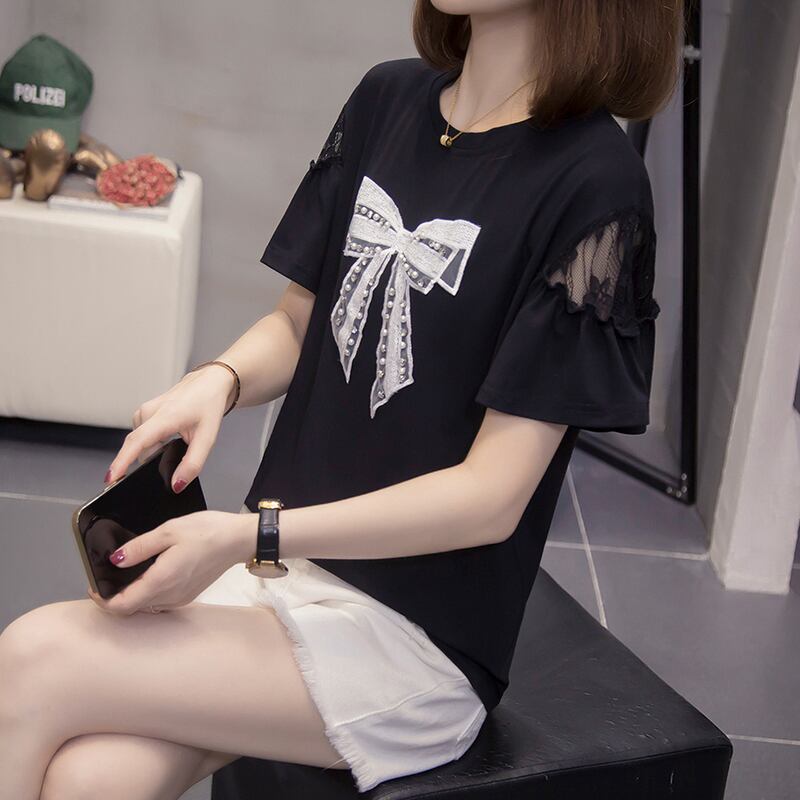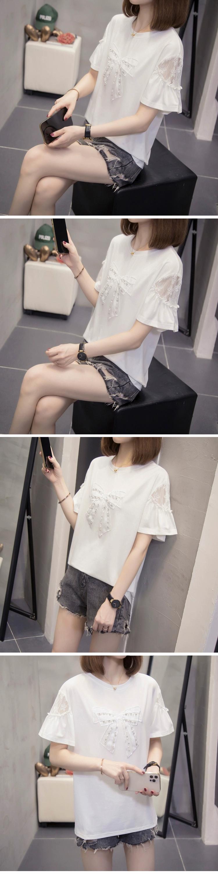 プラスサイズの女性 2023 脂肪姉妹夏カジュアルルーズリボンレースステッチ半袖 Tシャツトップ 大きめサイズ サマー 夏物 8884127044970400
