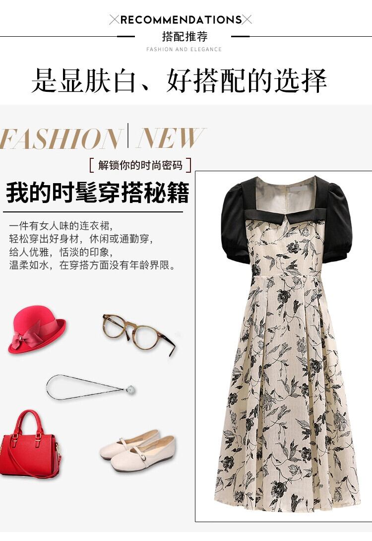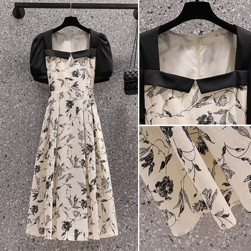 プラスサイズの婦人服 2023 脂肪姉妹夏新フレンチウエストパフスリーブスクエアカラーロングスカート花柄ドレス 大きめサイズ サマー 夏物 スクウェア 888411748892178