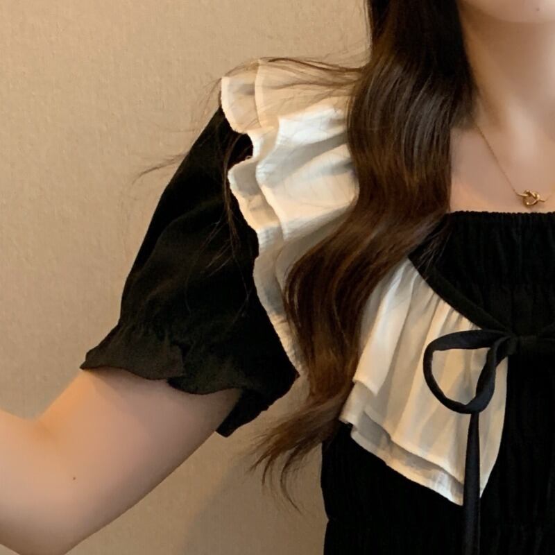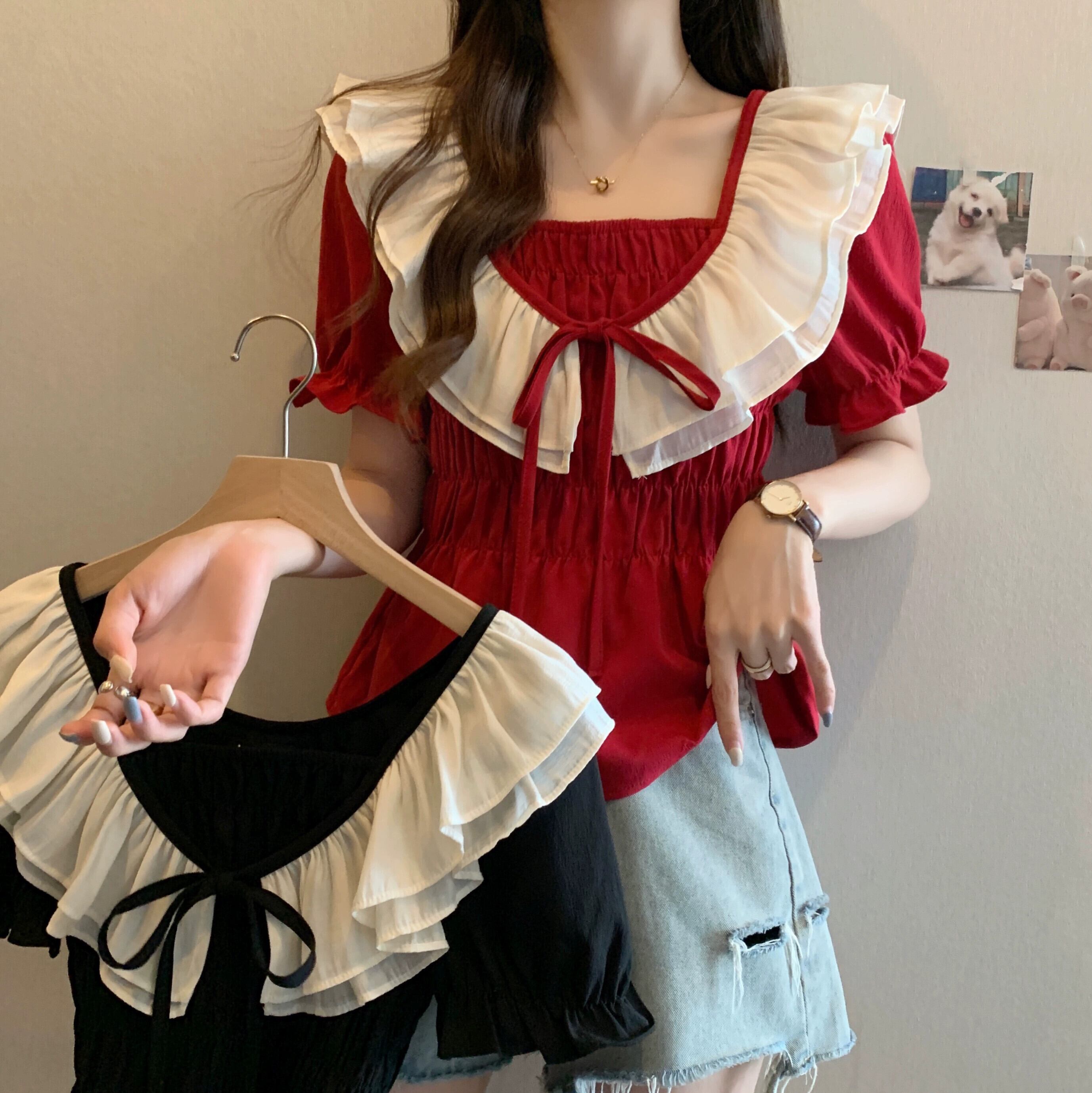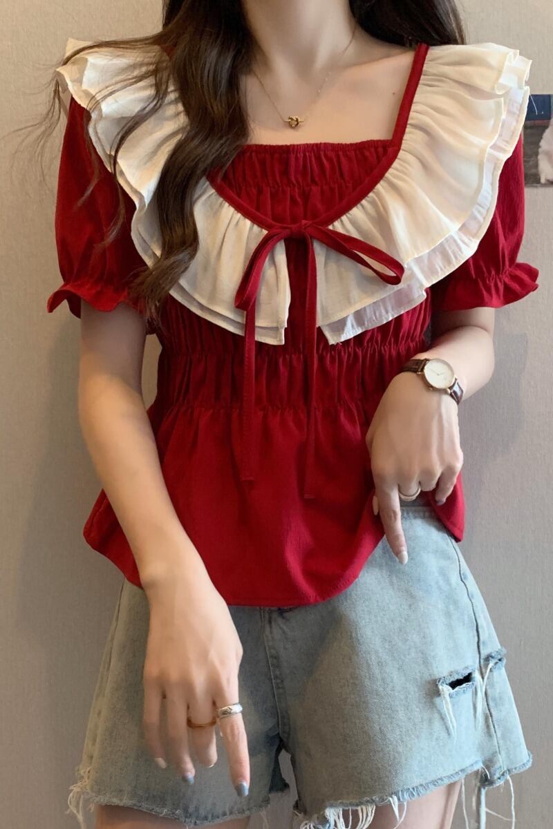 プラスサイズの婦人服 2023 夏服ファットシスターパフスリーブヒットカラースプライシング蓮の葉の襟シフォンシャツフランスの気質トップ 大きめサイズ サマー 夏物 8884167824921431