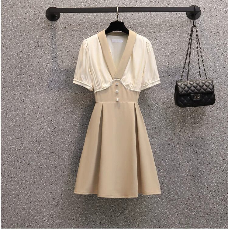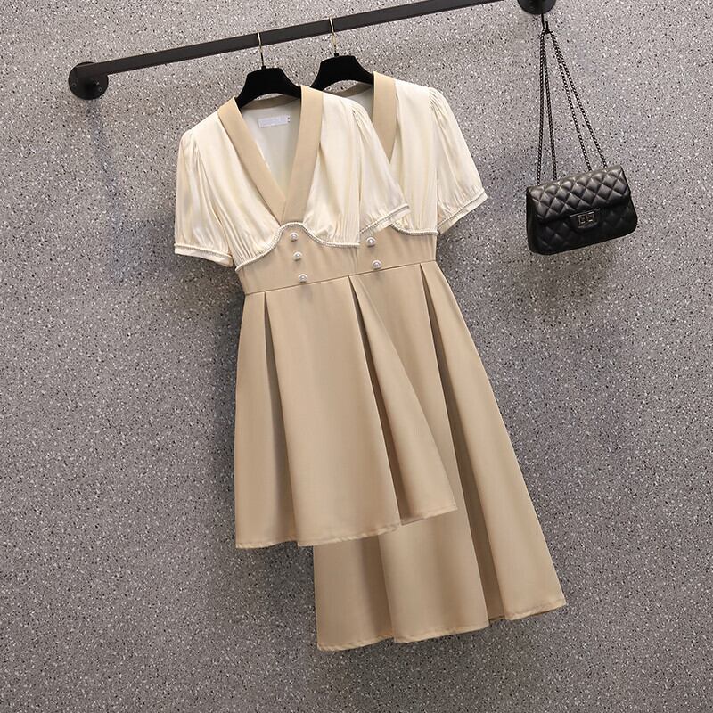 プラスサイズの婦人服 2023 脂肪姉妹夏新フレンチ V ネックスプライシングビーズウエスト痩身ドレス女性 大きめサイズ サマー 夏物 Vネック 888413256749108