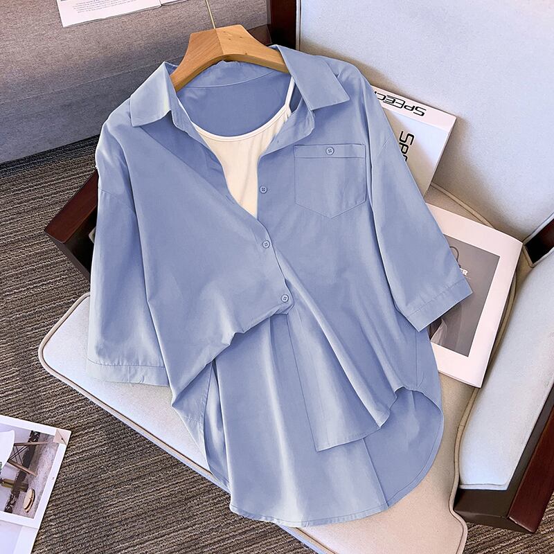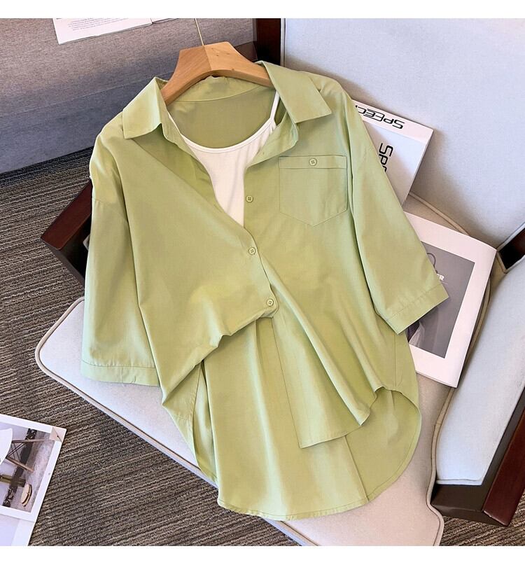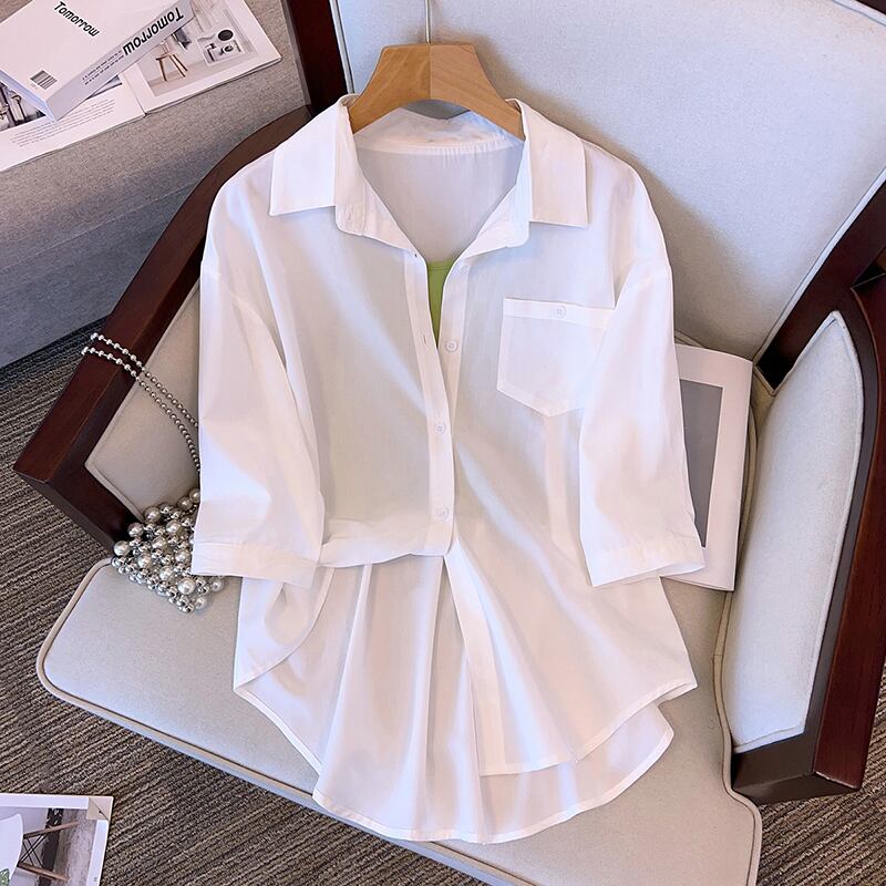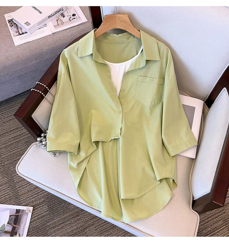 プラスサイズの婦人服 2023 脂肪姉妹夏の新ファッション非対称ミッドスリーブカーディガンシャツベスト 2 点セット 大きめサイズ サマー 夏物 8884171973351629