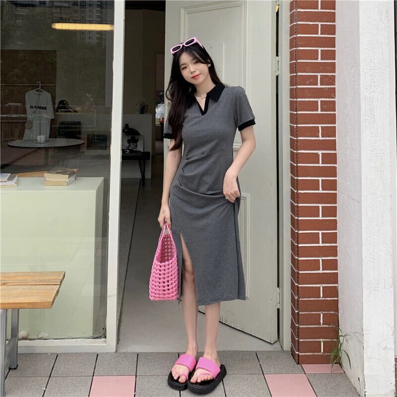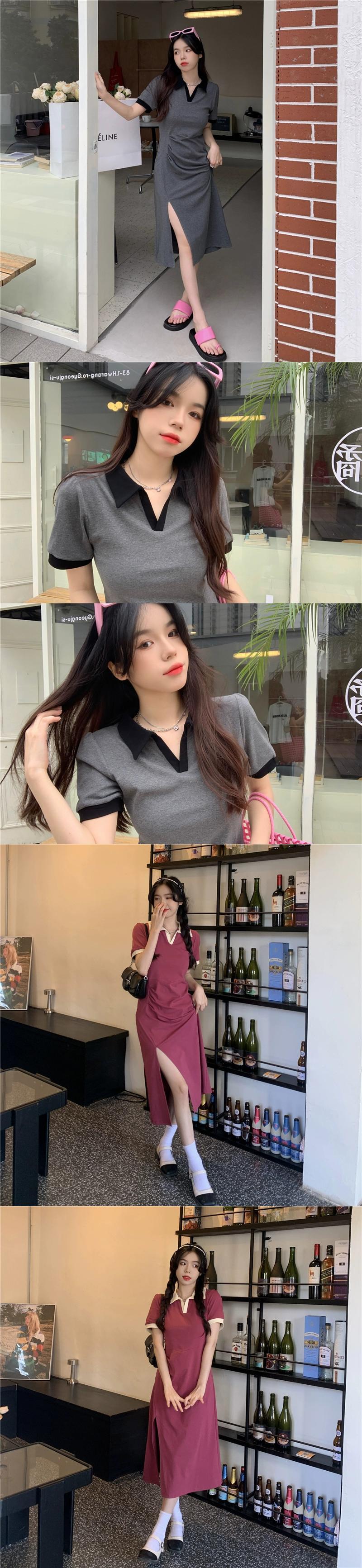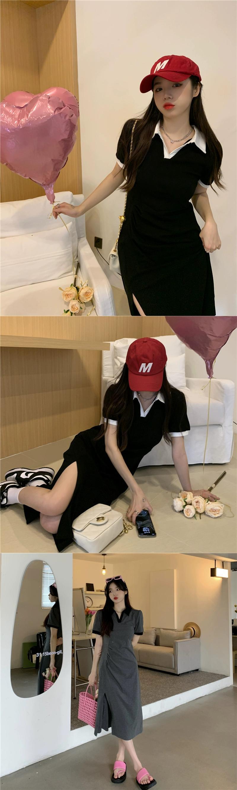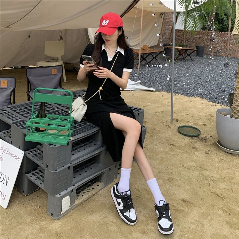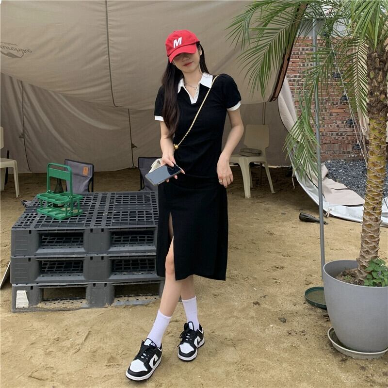 プラスサイズの婦人服 2023 流行の女性の夏の新しいファットシスターカバー肉高級感カラーコントラスト POLO 半袖スリットドレス 大きめサイズ サマー 夏物 8884124270774514