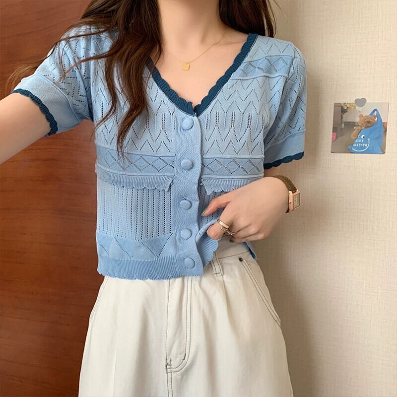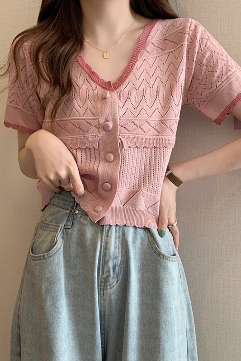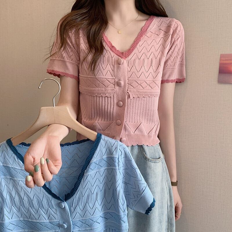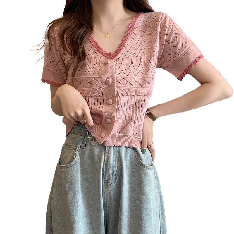 ファットシスターサマードレス半袖ニットセーターコントラストカラートップアインスタイルtシャツデザインシックなカーディガンピンクの小さなシャツ 夏物 8884147443061913