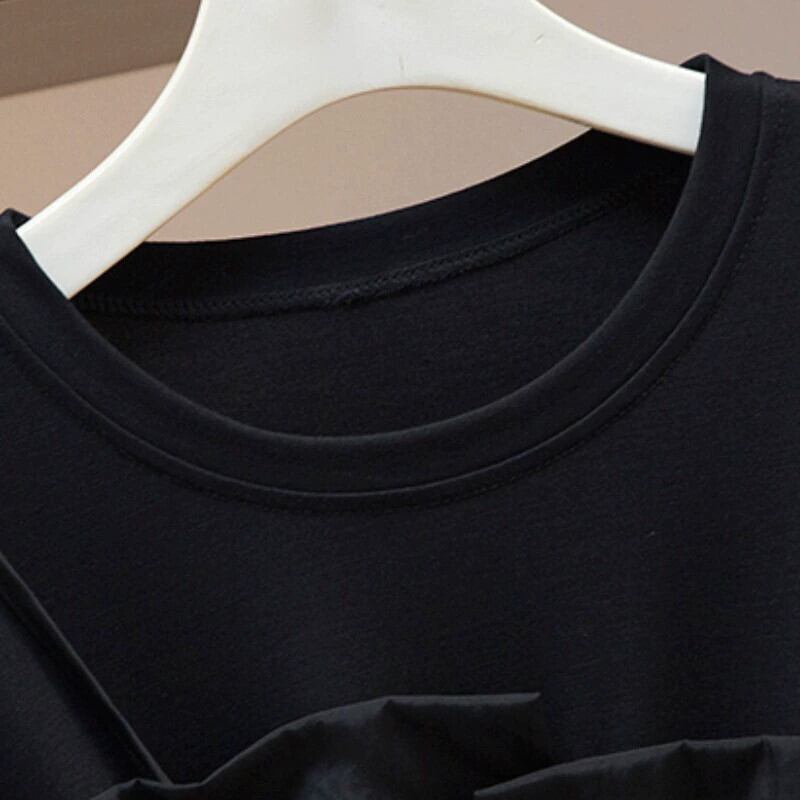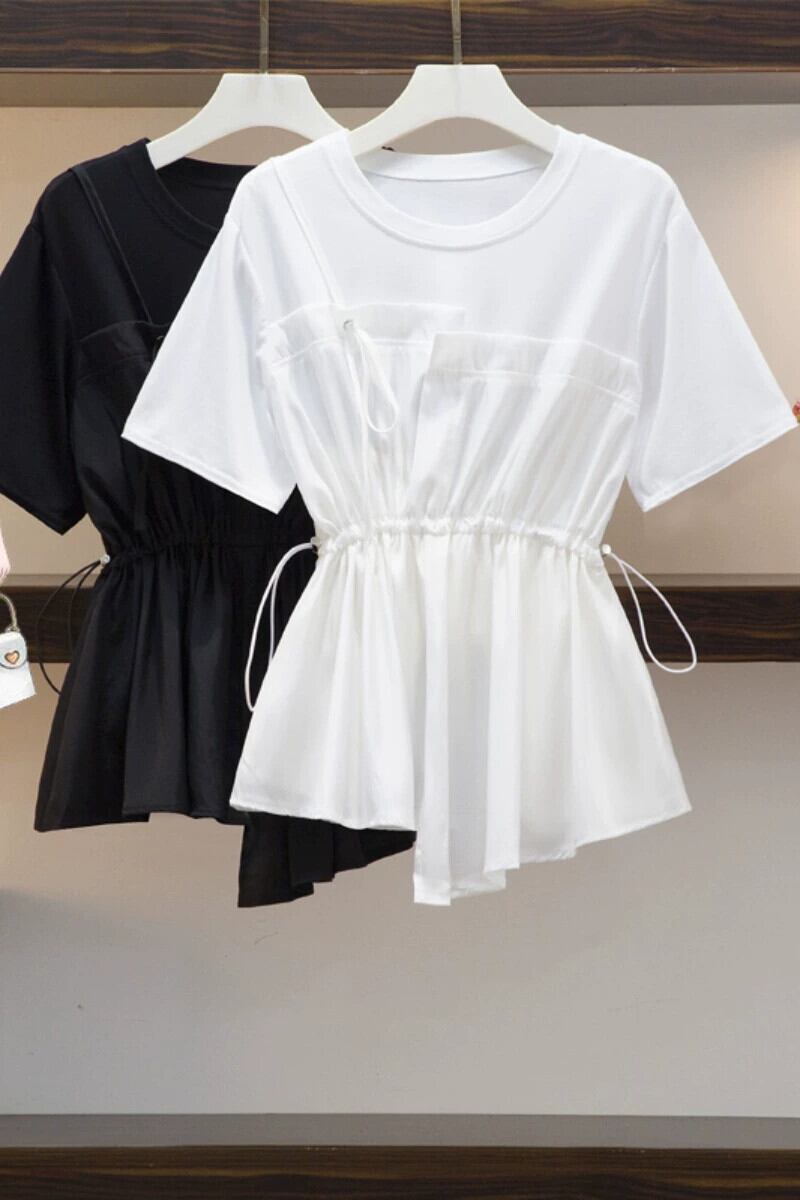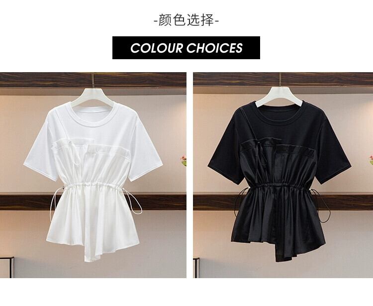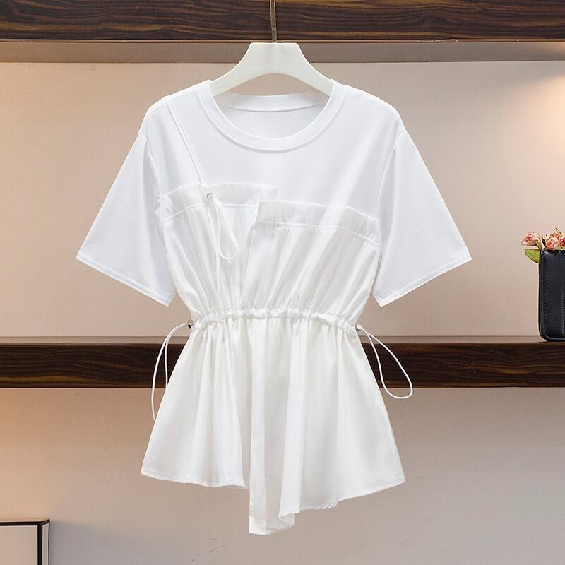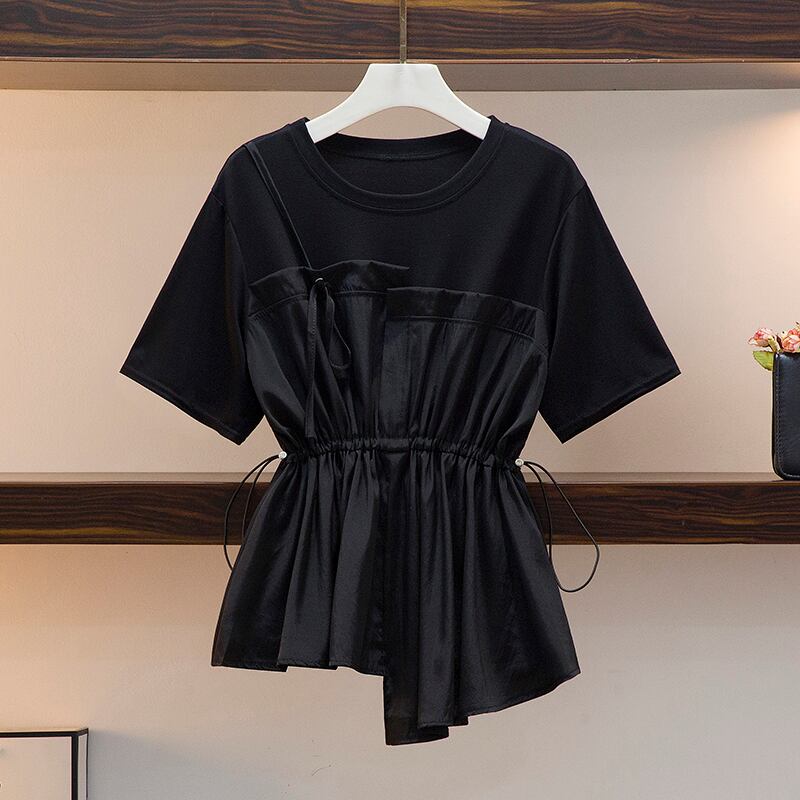 プラスサイズの婦人服 2023 夏の新脂肪姉妹 eign スタイル年齢削減ウエスト痩身シフォンスプライシング腹カバー T シャツ 大きめサイズ サマー 夏物 Tシャツ 8884194477461528