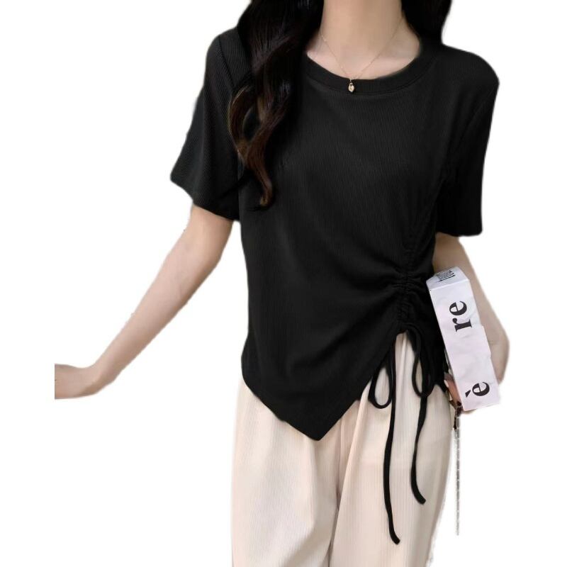 プラスサイズの婦人服 2023 ファットシスター夏の新しいフロントショルダードローストリング痩身不規則な注意マシンオールマッチトップス 大きめサイズ サマー 夏物 8884123849016237