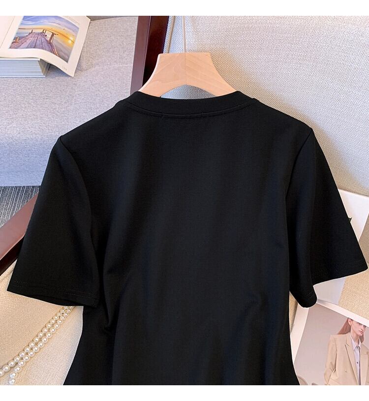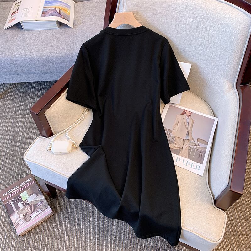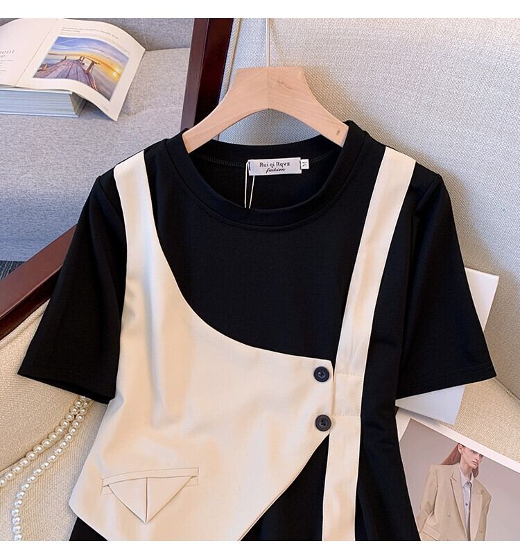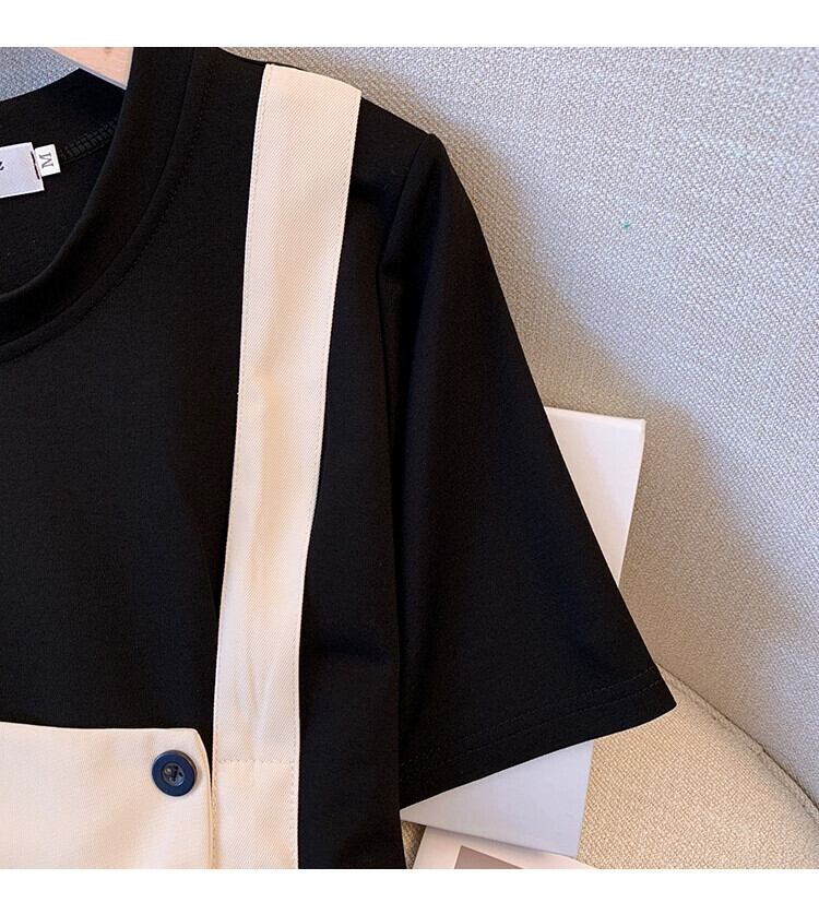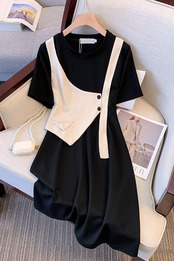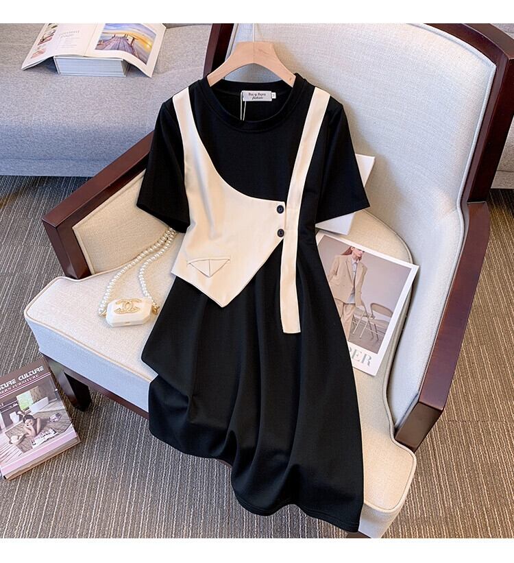 プラスサイズの婦人服 2023 脂肪姉妹夏の新しいミッドレングススタイル薄いルーズ半袖偽ツーピースドレス女性 大きめサイズ サマー 夏物 8884150807926938