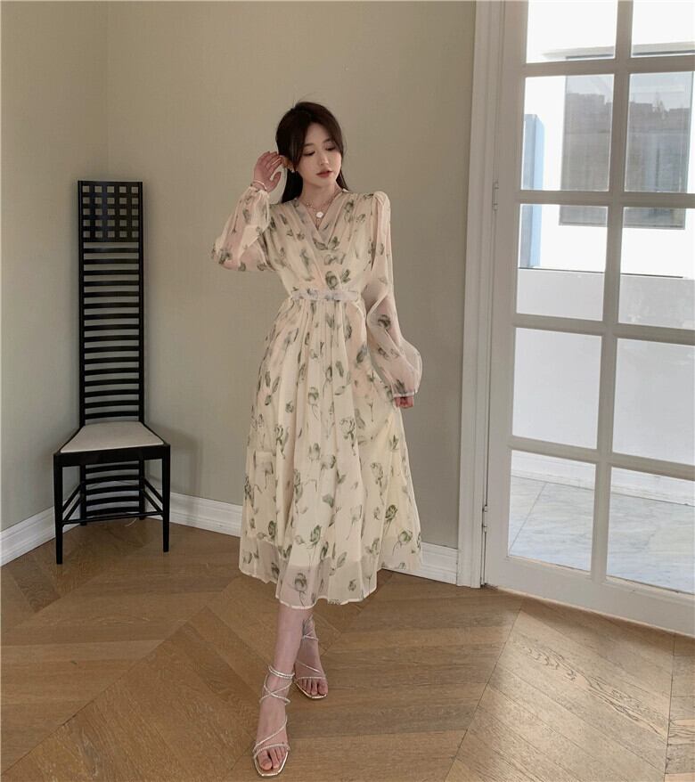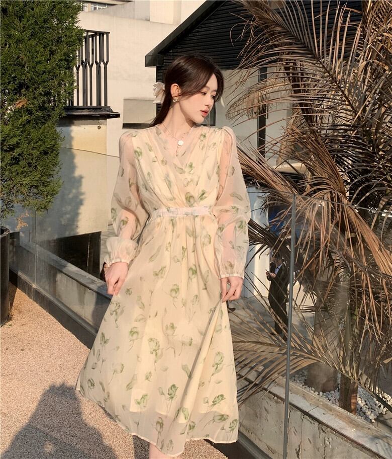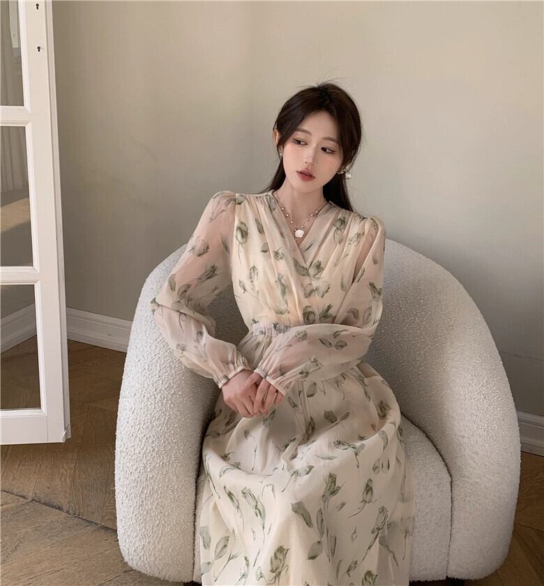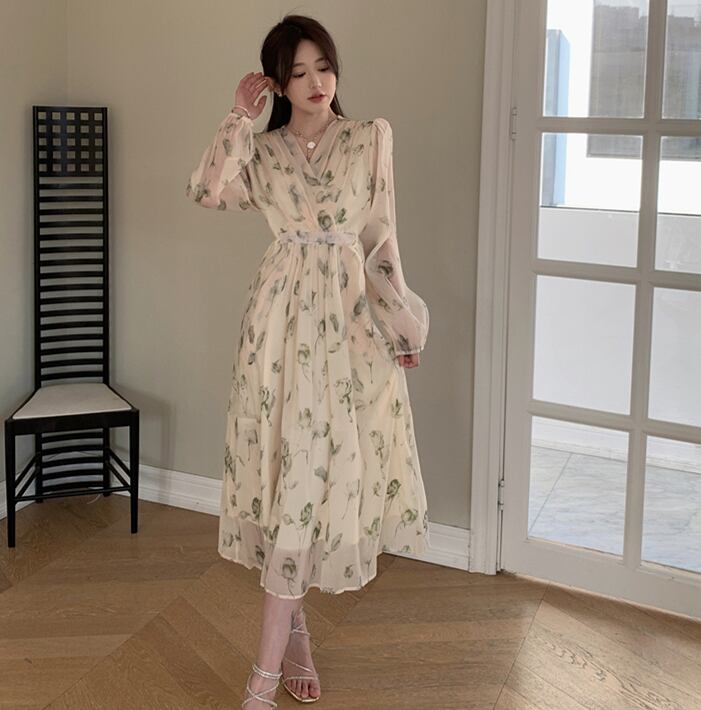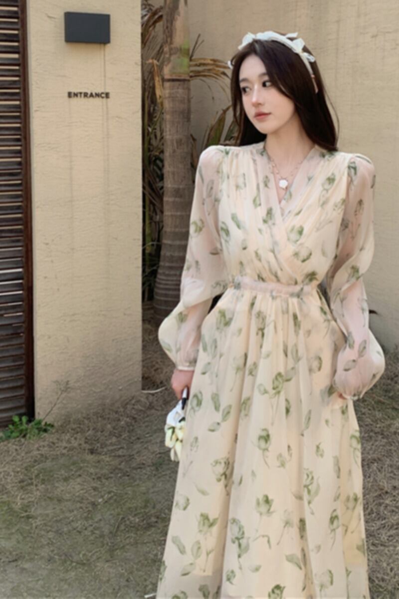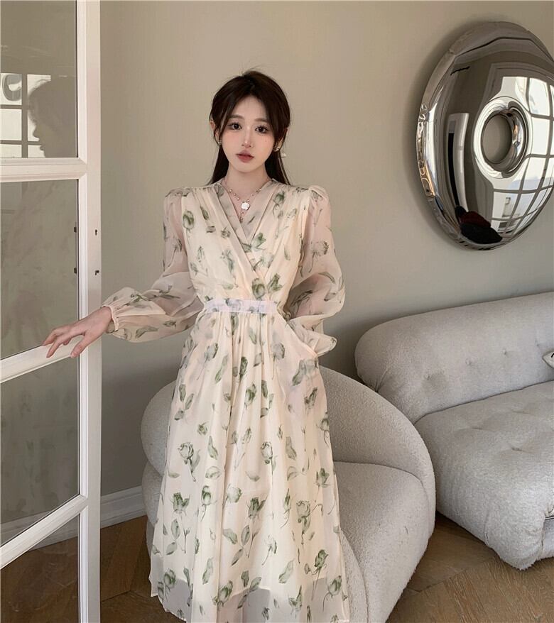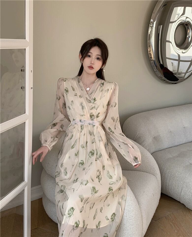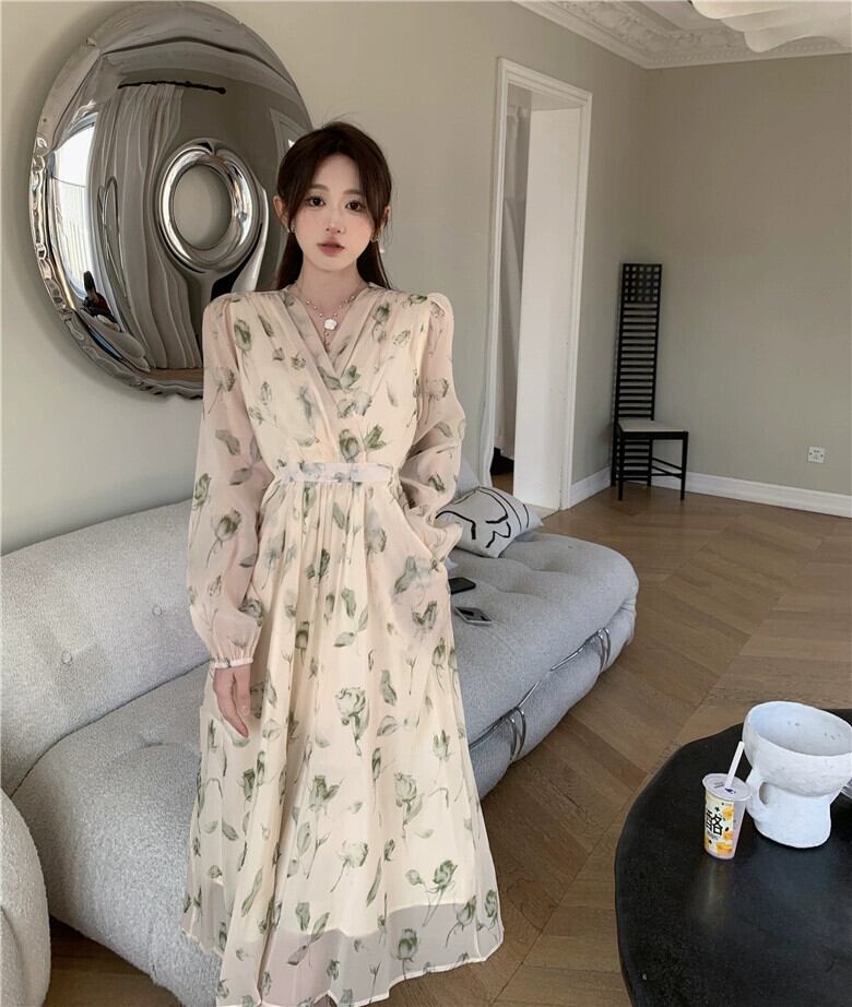 プラスサイズの婦人服 2023 春服脂肪姉妹新しいフレンチネクタイウエストロング V ネック花柄ドレス女性 大きめサイズ スプリング 春物 Vネック 8884147117698550