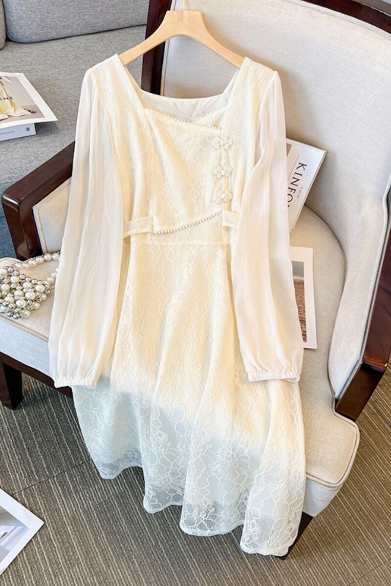 大きいサイズの婦人服 2023 春服脂肪姉妹新しいチャイナドレスレースステッチシフォンレトロ長袖ドレス女性 ロング 大きめサイズ スプリング 春物 8884132769975865