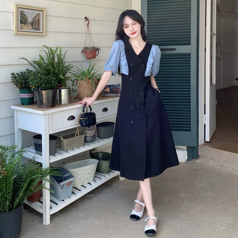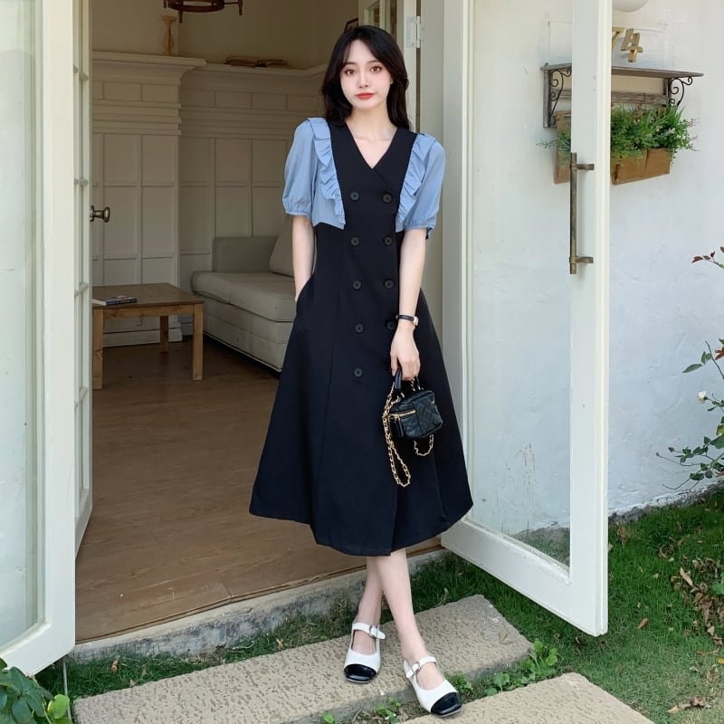 プラスサイズの婦人服 2023 流行の女性の夏の新しいスタイルのファットシスタースプライシングコントラストカラーの木耳サイド気質薄いオールマッチドレス 大きめサイズ サマー 夏物 8884186719877303