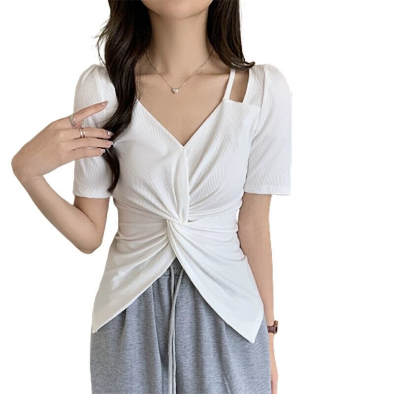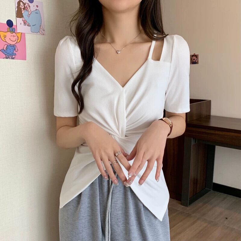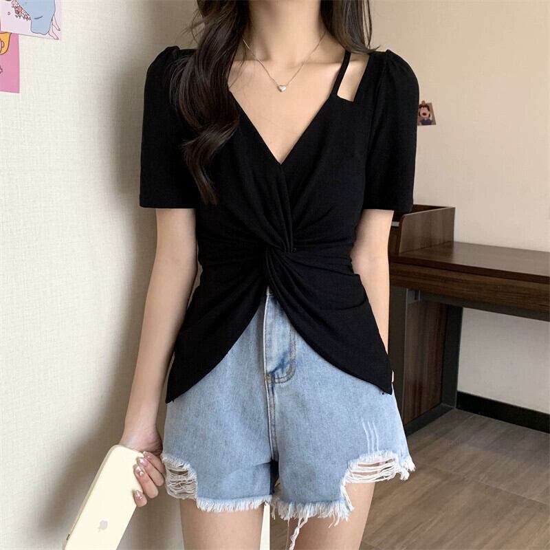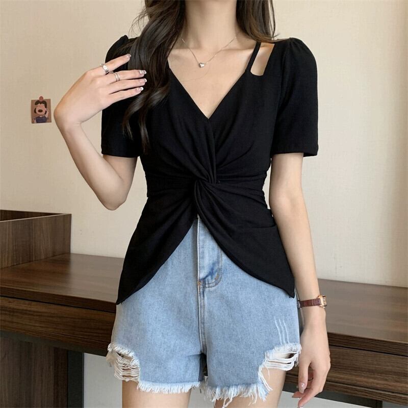 プラスサイズの婦人服 2023 トレンディな女性の夏の新しいファットシスタートレンディな純粋な欲望スタイルのステッチクロスハンギングネック半袖 T シャツ 大きめサイズ サマー 夏物 Tシャツ ピュア 8884152584806003