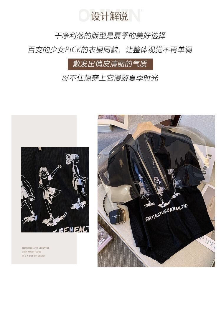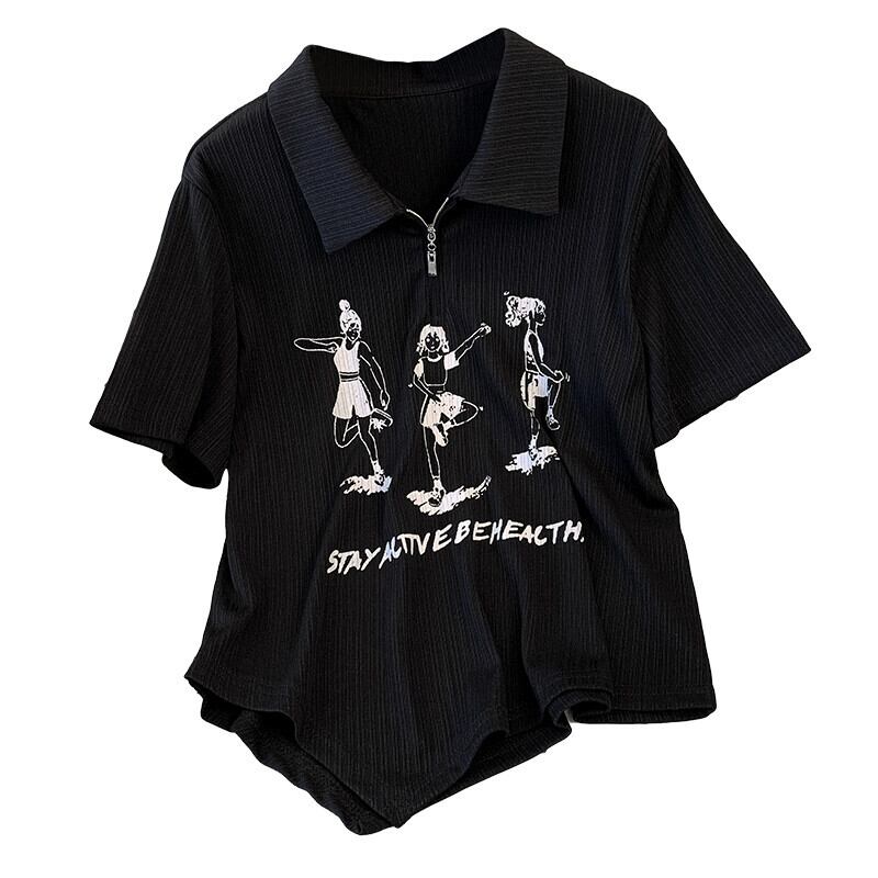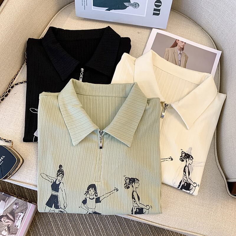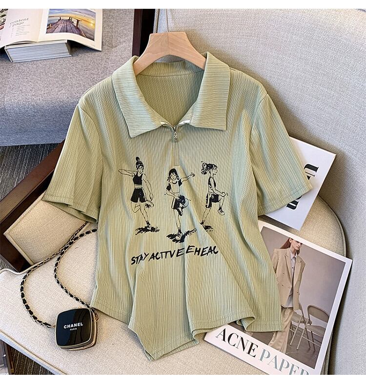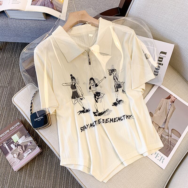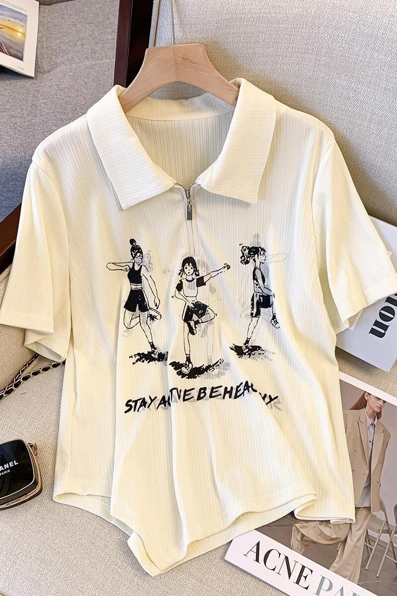 大きいサイズの婦人服 2023 夏の新ファッション脂肪姉妹ハーフオープンカラープリント半袖トップ Tシャツ女性 大きめサイズ サマー 夏物 8884170486954431