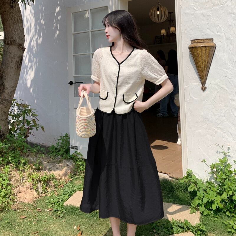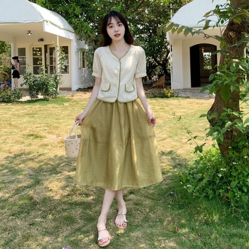 プラスサイズの婦人服 2023 流行の女性の夏の新しいファットシスターオールマッチショートトップ痩身無地スカート 2 点セット 大きめサイズ サマー 夏物 ソリッドカラー 8884198315442874