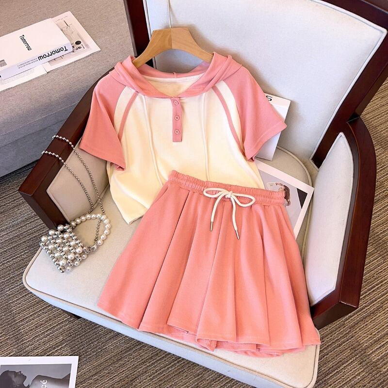 プラスサイズの婦人服 2023 流行の女性の夏の新しいファットシスターカジュアルフード付き Tシャツ巾着弾性ウエストショーツ 2 点セット エラスティック 伸縮 大きめサイズ サマー 夏物 ブルマー 8884190546325665