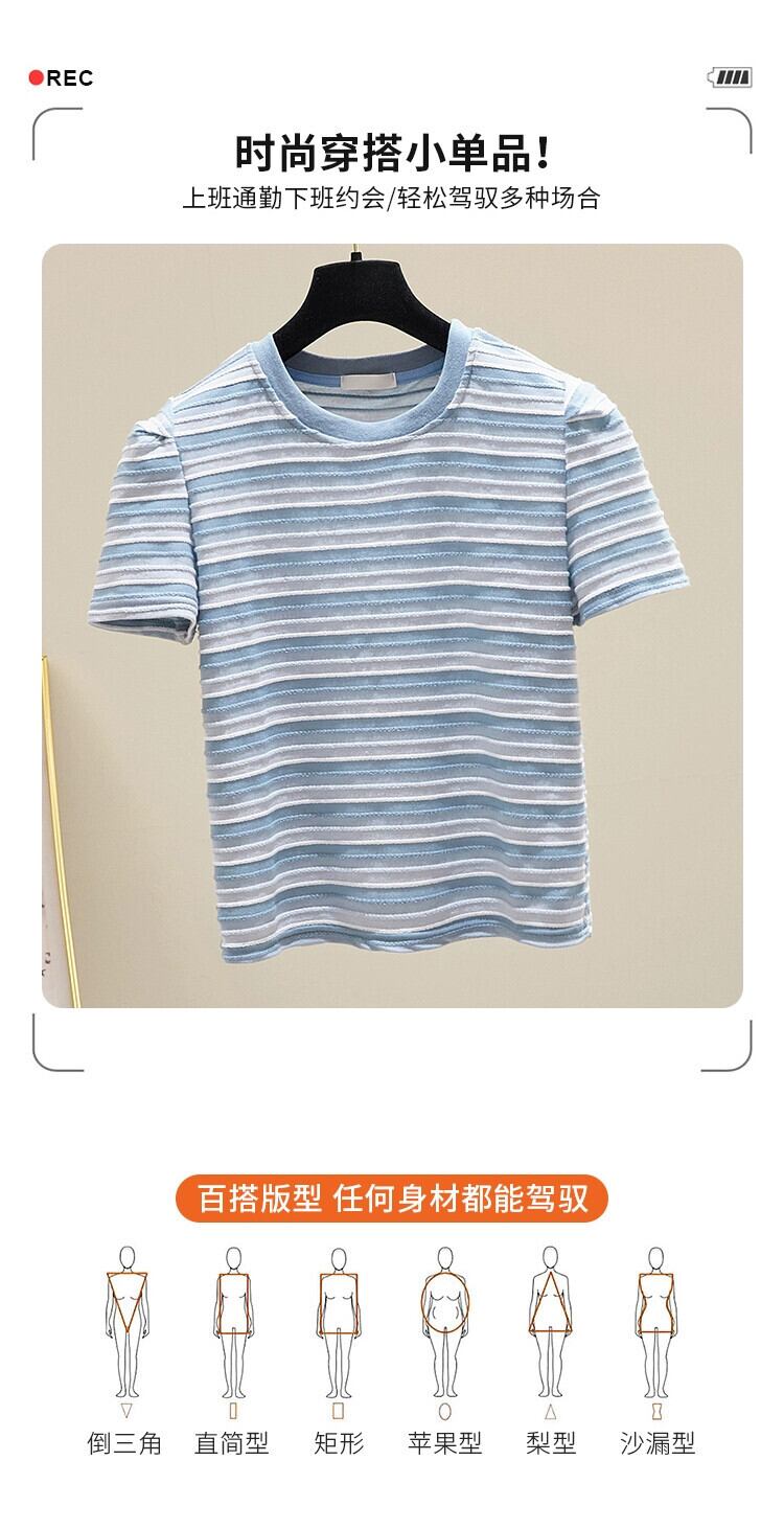プラスサイズの婦人服 2023 夏服新しい太った妹は痩せてオールマッチストライプ腹カバーラウンドネック半袖カジュアルトップ 大きめサイズ サマー 夏物 Oネック 8884193675239662