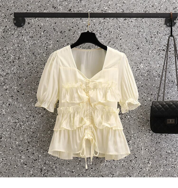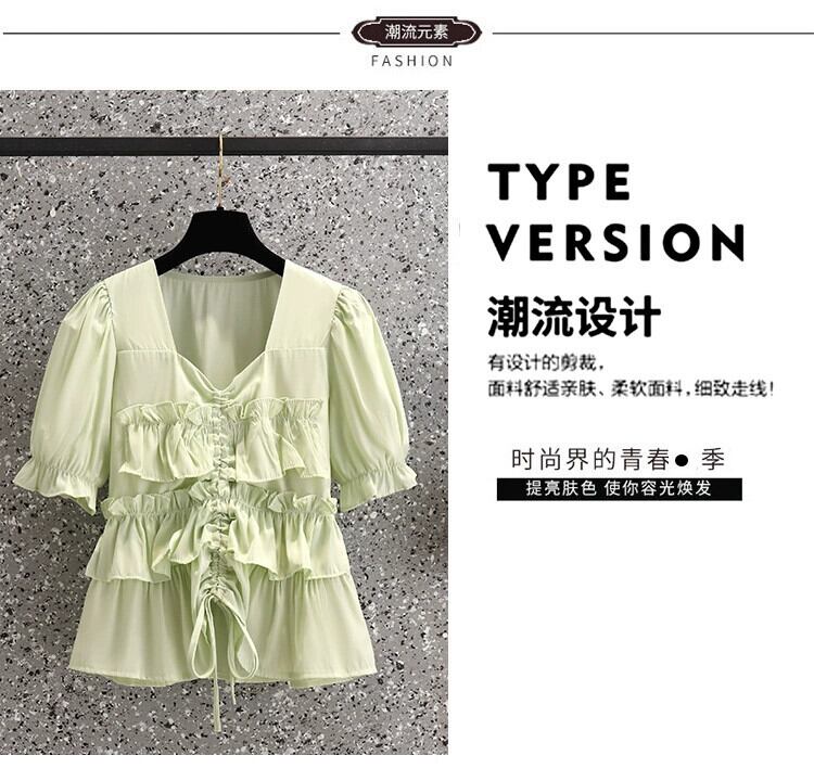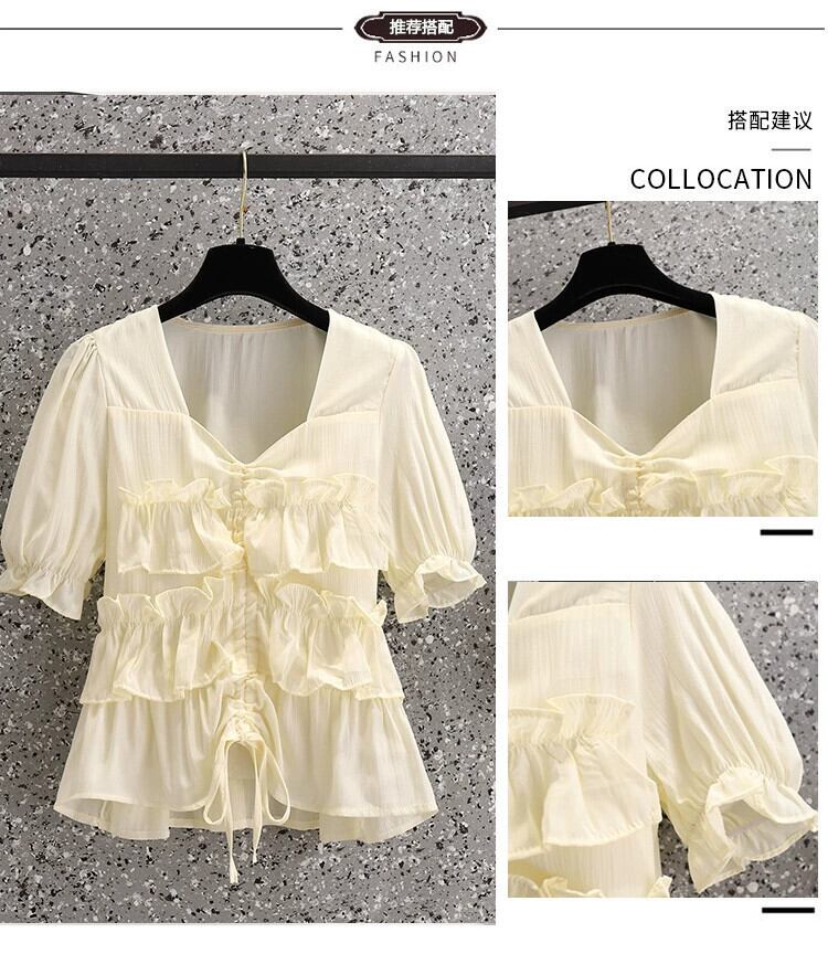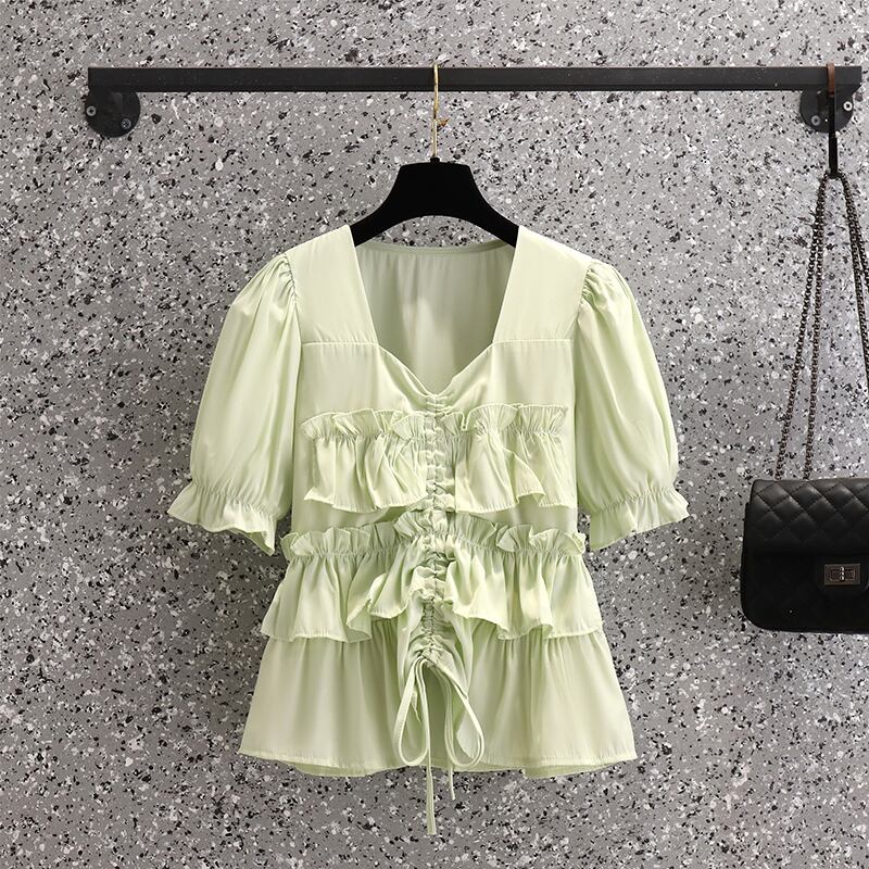 プラスサイズの婦人服 2023 夏の新しい脂肪姉妹シックなシフォン気質フリル腹カバーデザイントップ 大きめサイズ サマー 夏物 8884132069291982