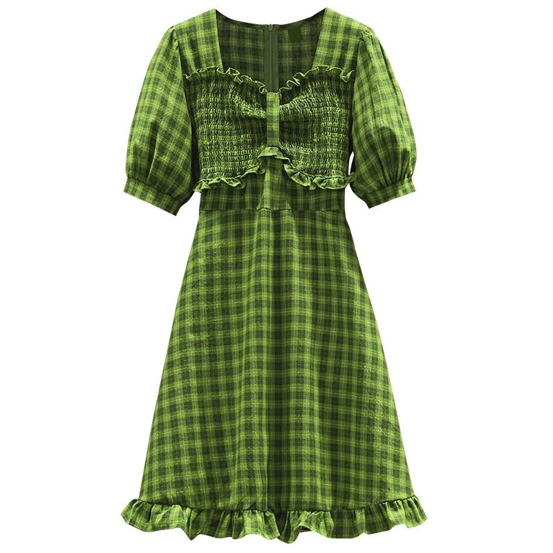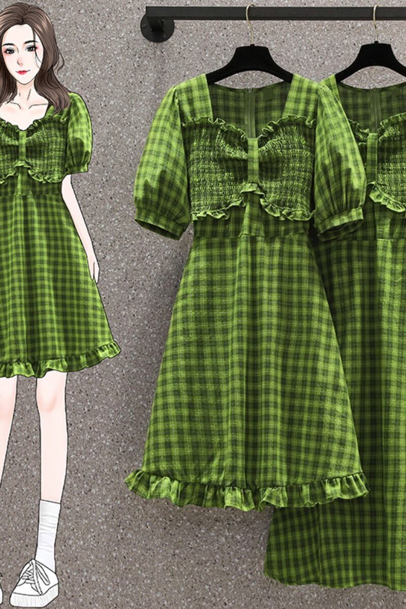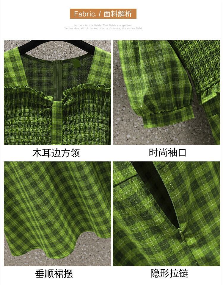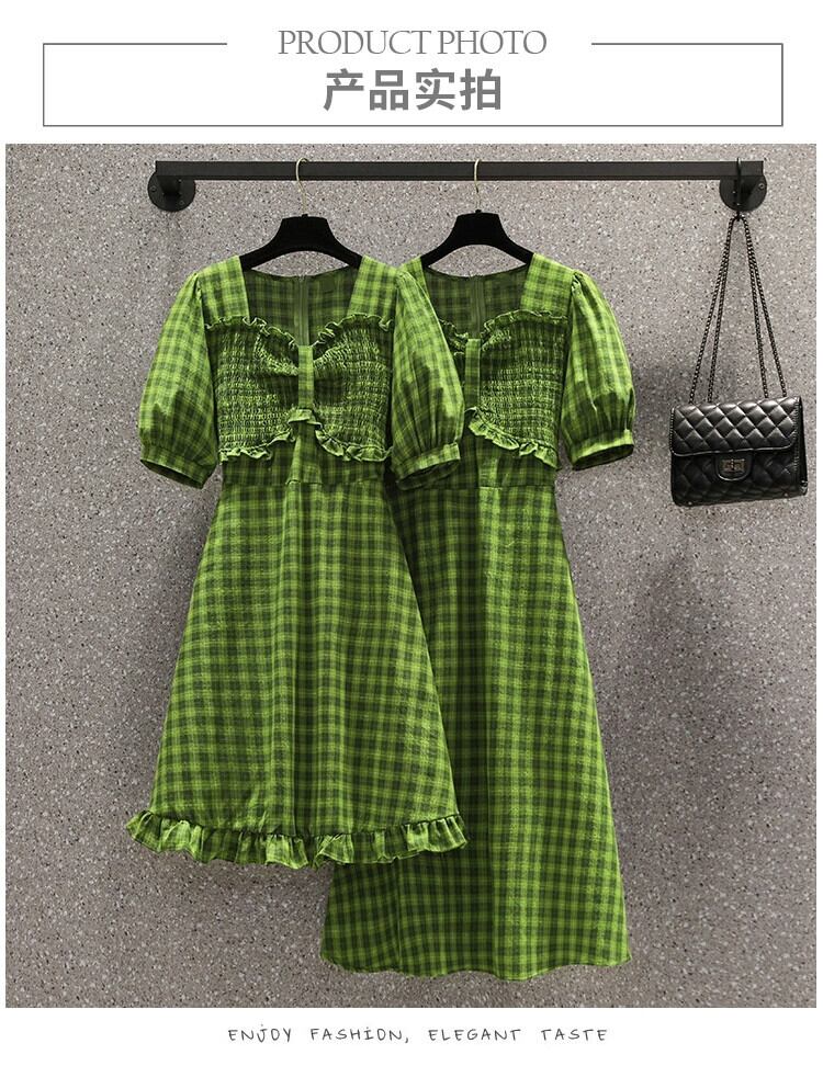 プラスサイズの婦人服 2023 夏服ファットシスターズ新しいスタイル A ラインスカートグリーンチェック柄ウエストドレス 大きめサイズ サマー 夏物 Aライン 8884161558694460