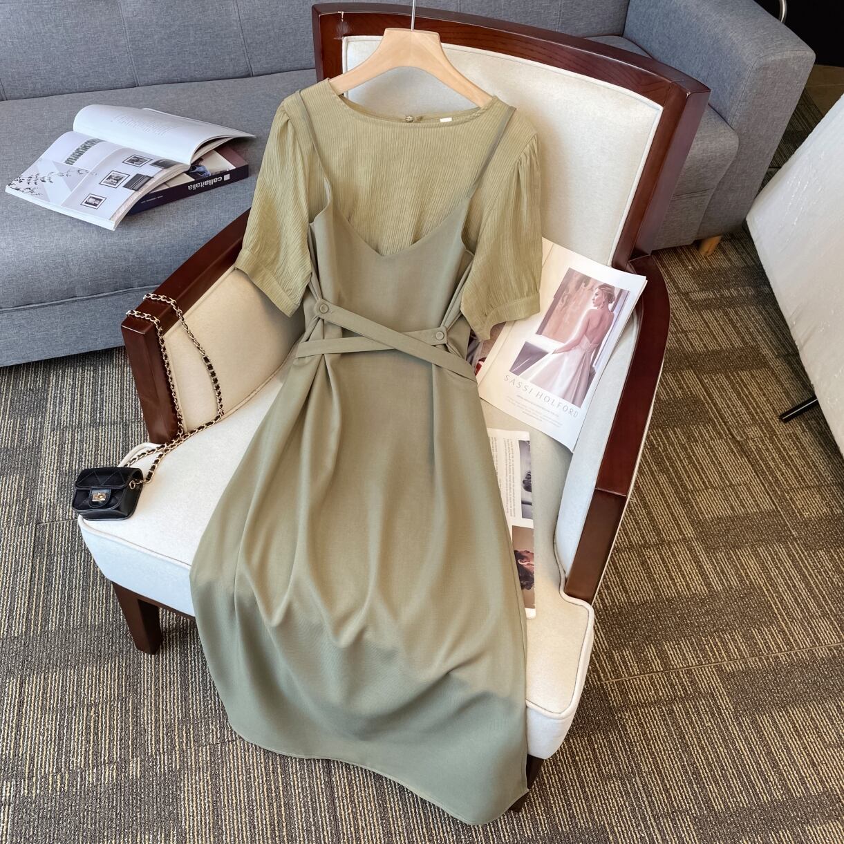 プラスサイズの婦人服 2023 夏の新ファットシスターファッションオールマッチフェイクツーピースウエストフレンチ半袖ドレス 大きめサイズ サマー 夏物 8884174273011410