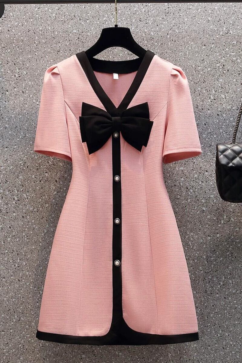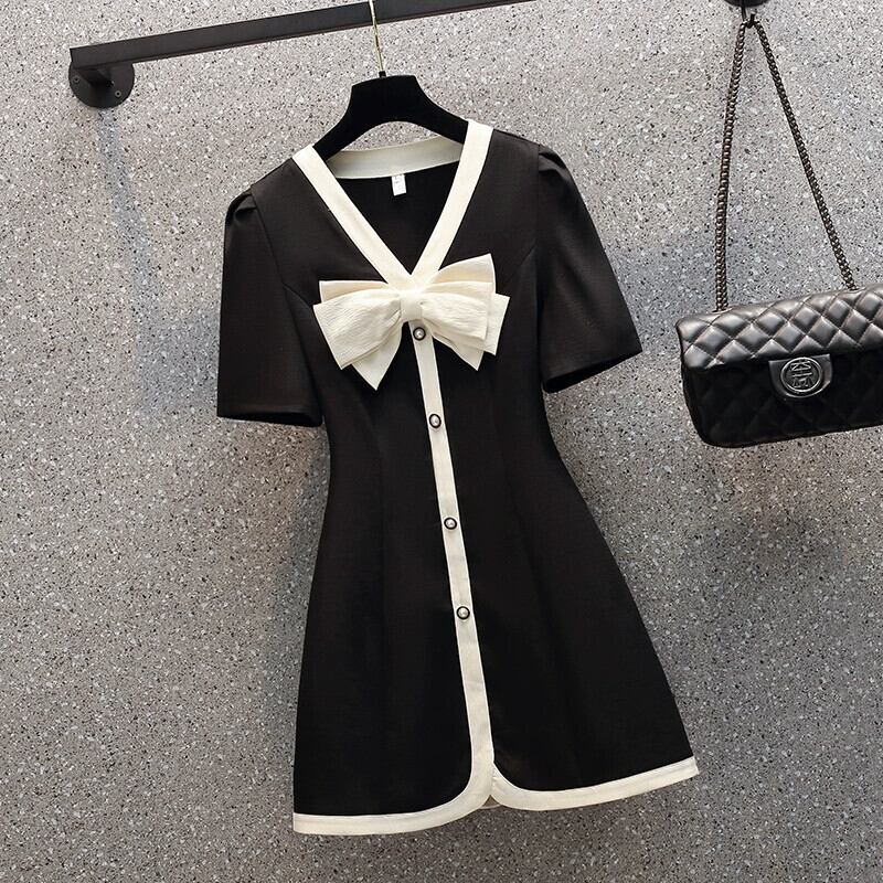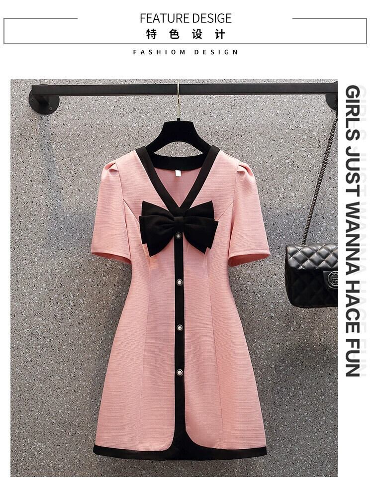 プラスサイズの婦人服 2023 夏の新脂肪姉妹バージョンスリムウエスト痩身 V ネックちょう結びドレス リボン 大きめサイズ サマー 夏物 Vネック 8884179374976683