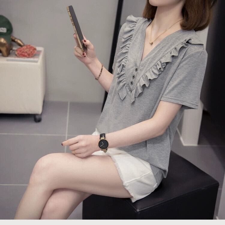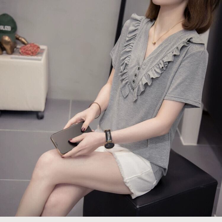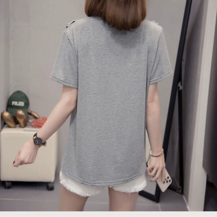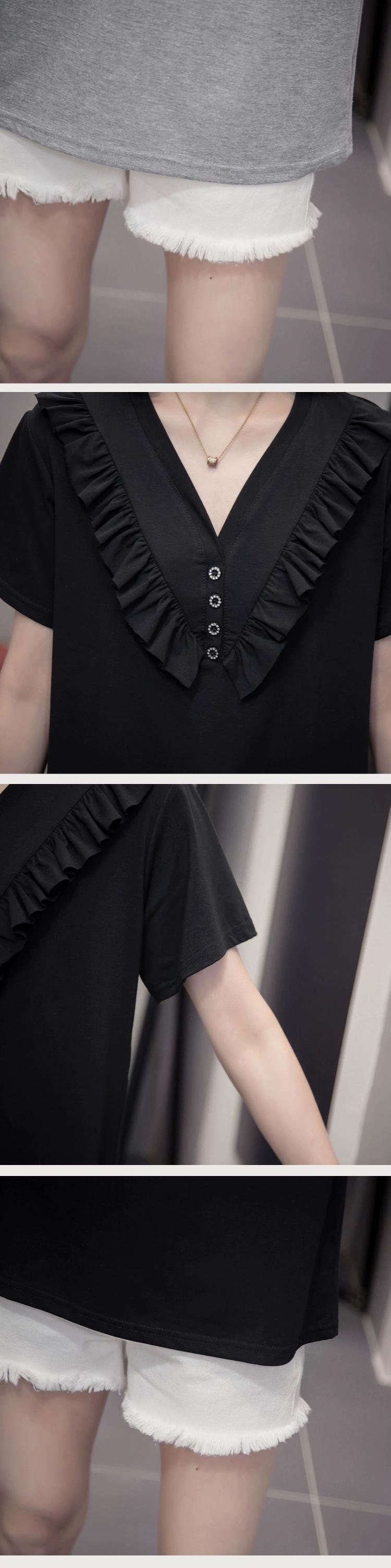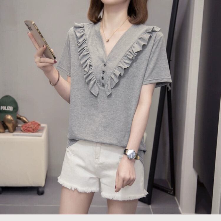 プラスサイズの婦人服 2023 流行の女性の夏の新しい太った姉妹ゆるくて薄いファッション気質個性 V ネック半袖 T シャツ 大きめサイズ サマー 夏物 Vネック Tシャツ 8884180167037515
