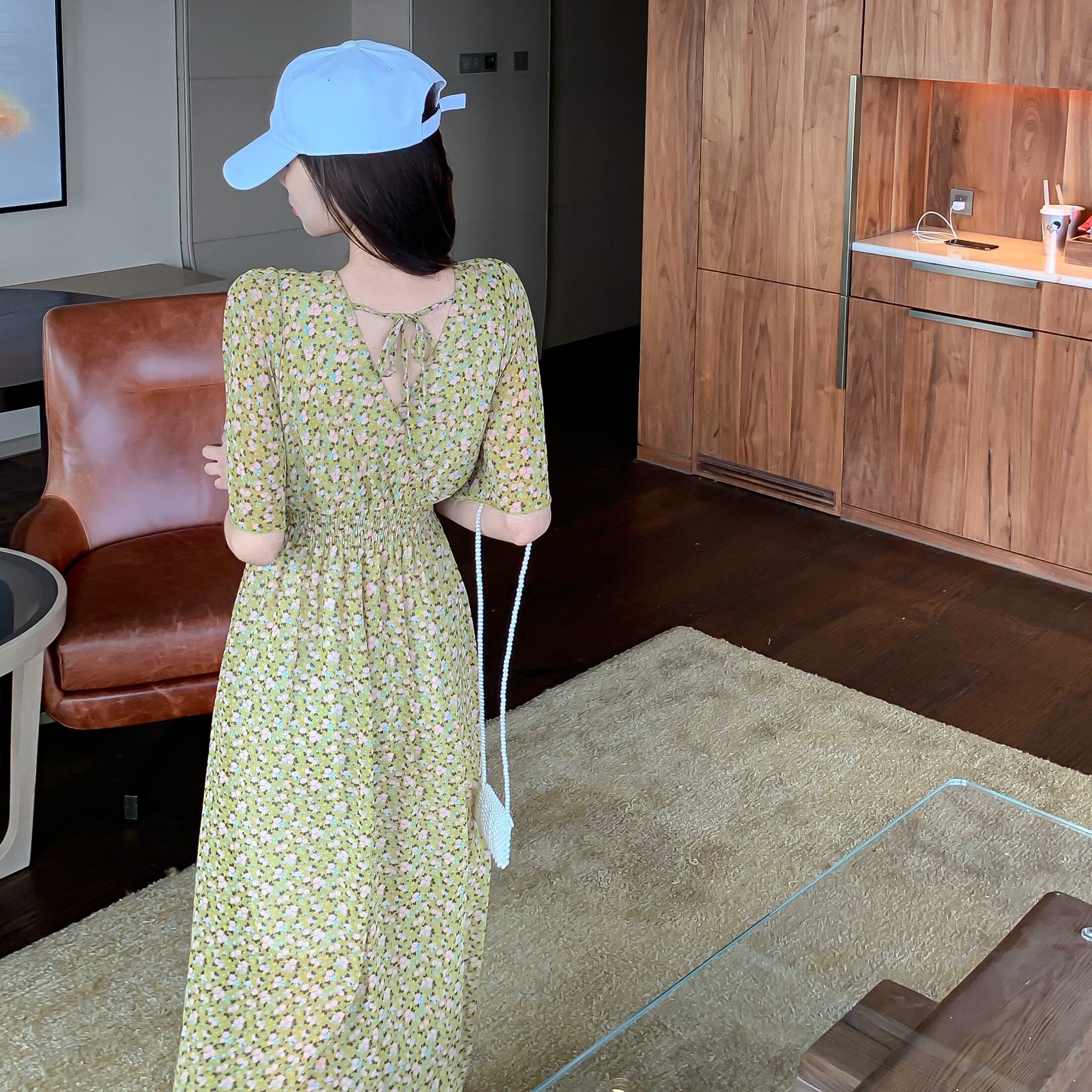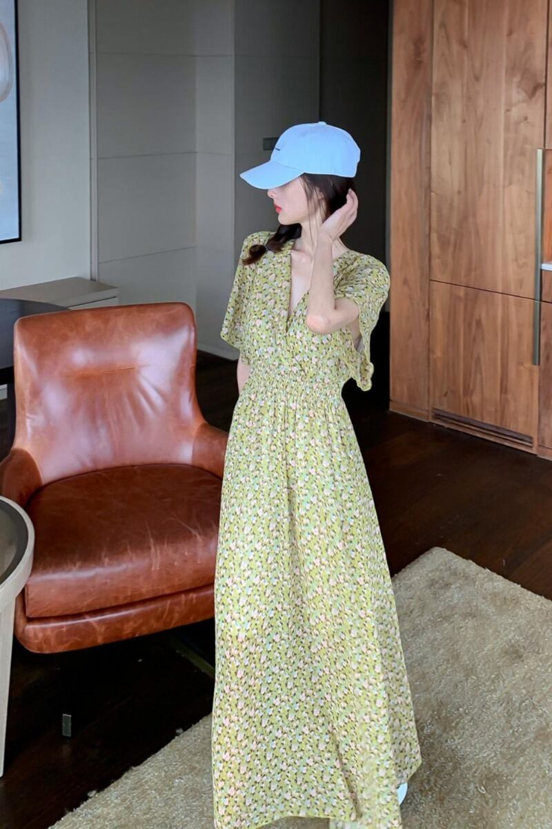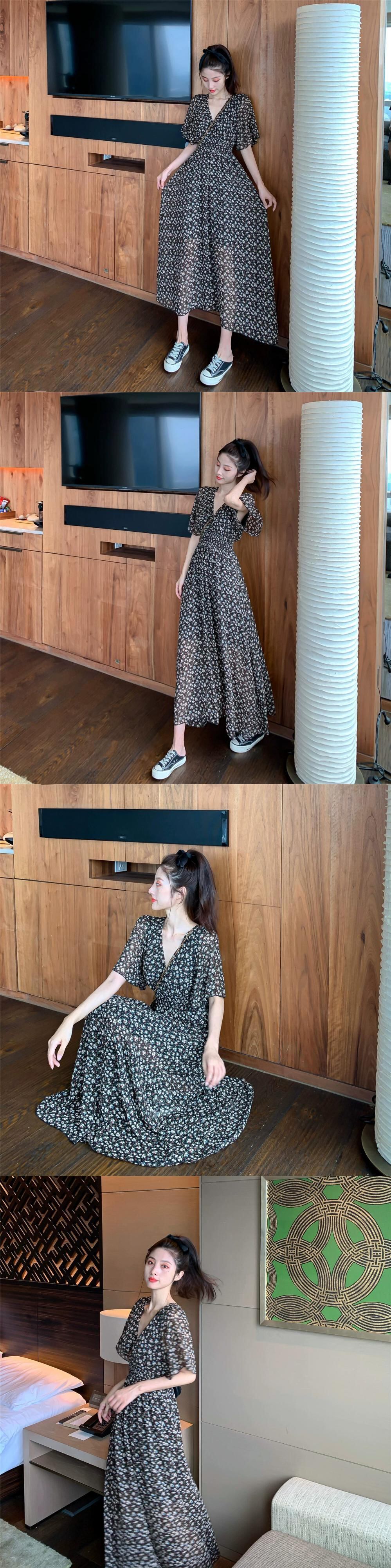 プラスサイズの婦人服 2023 脂肪姉妹夏の新ファッションウエスト花柄シフォン膝上 V ネックドレス女性 大きめサイズ サマー 夏物 Vネック 8884193323363207