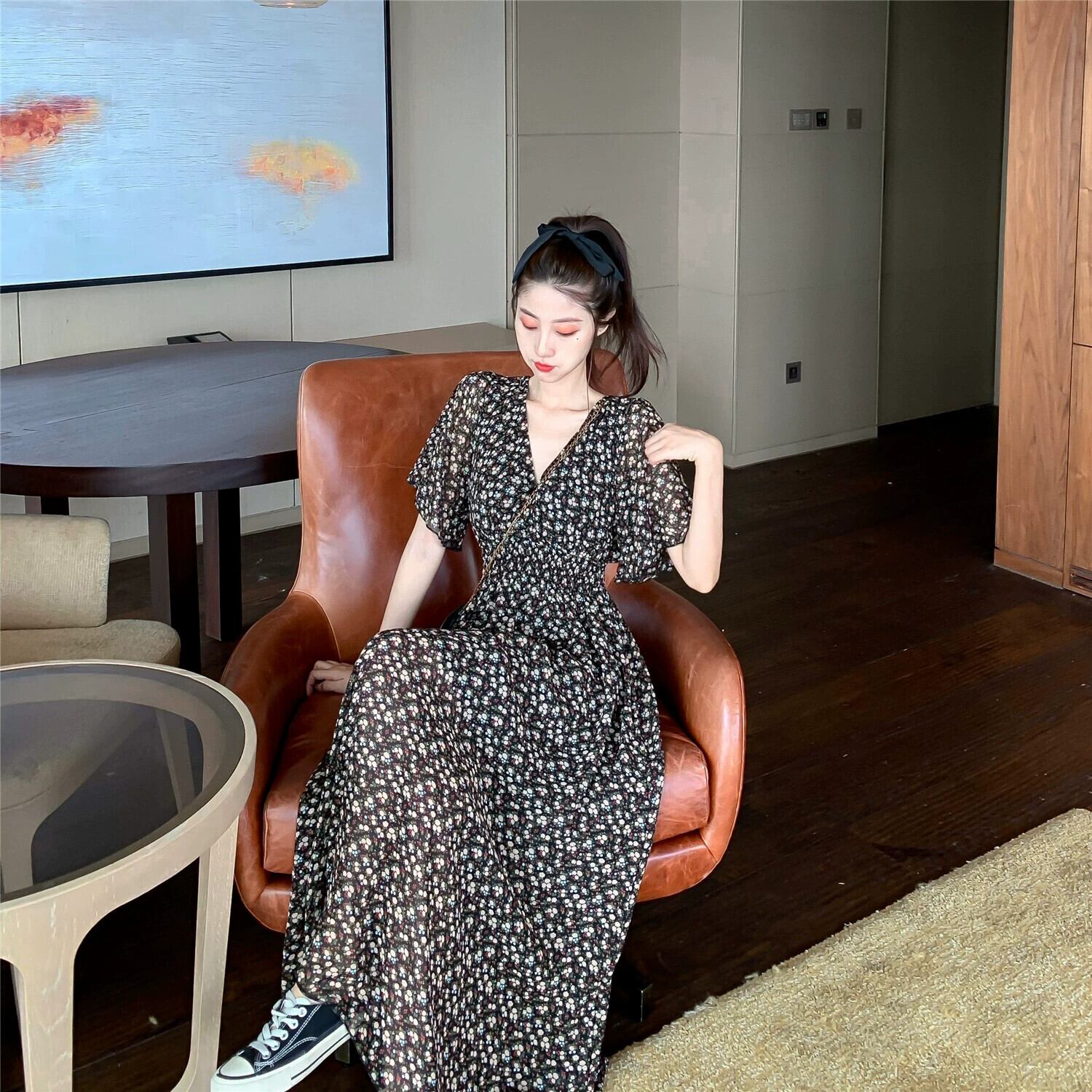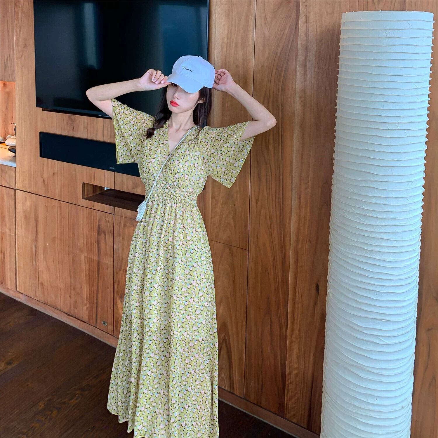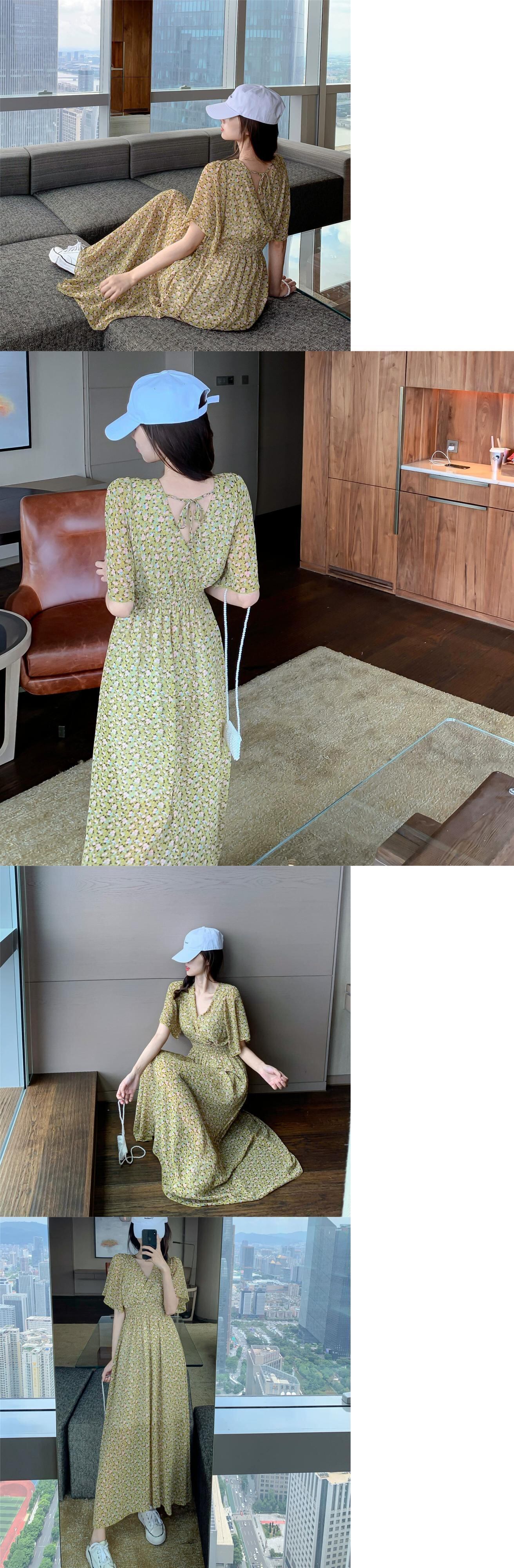 プラスサイズの婦人服 2023 脂肪姉妹夏の新ファッションウエスト花柄シフォン膝上 V ネックドレス女性 大きめサイズ サマー 夏物 Vネック 8884193323363207