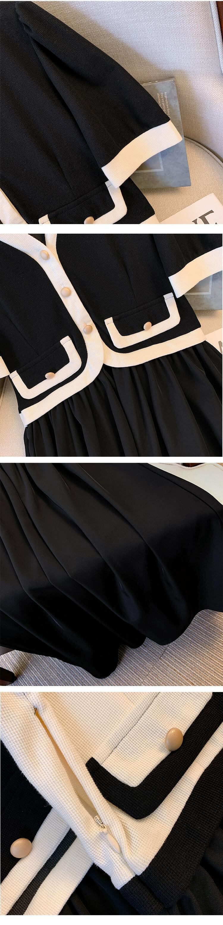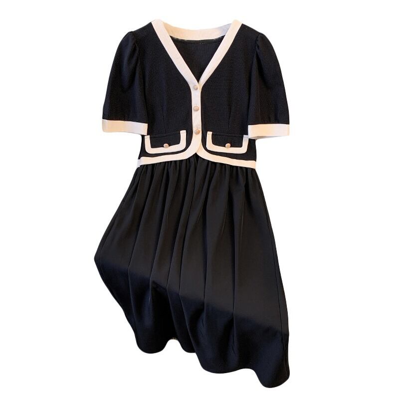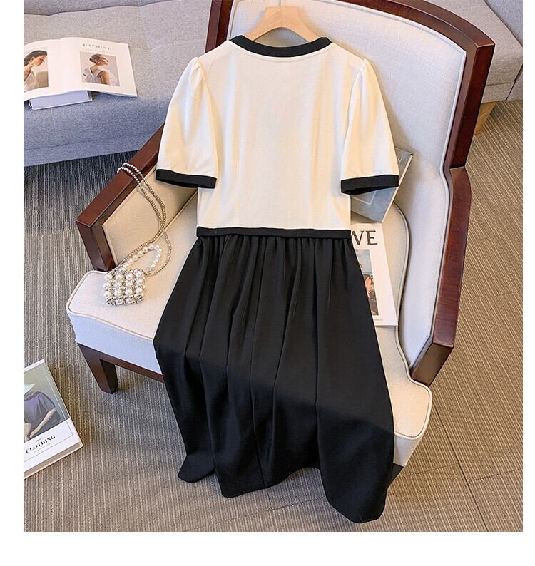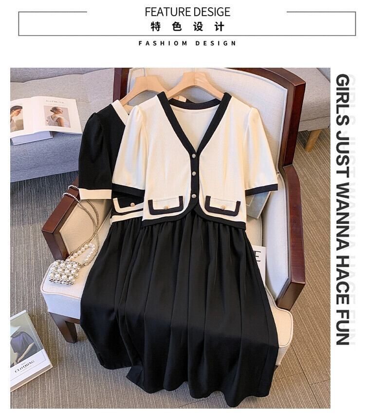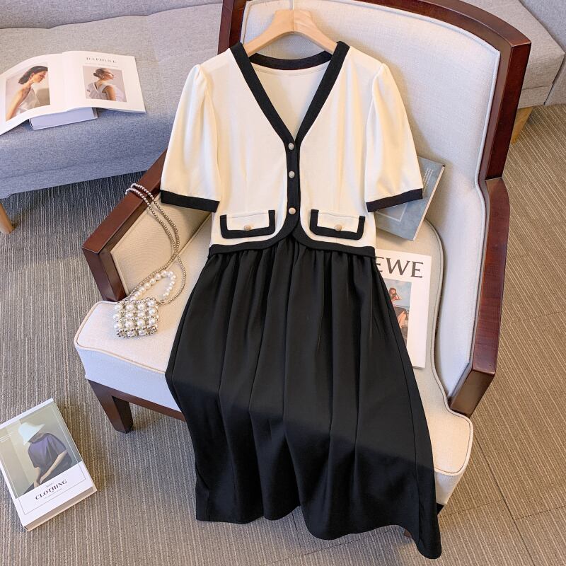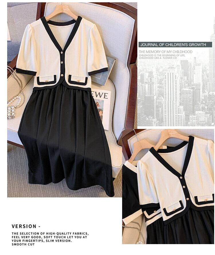 プラスサイズの婦人服 2023 流行の女性の夏の新しいファットシスターフェイクツーピースシングルブレストフレンチカラーコントラスト気質ドレス女性 大きめサイズ サマー 夏物 8884177678310116
