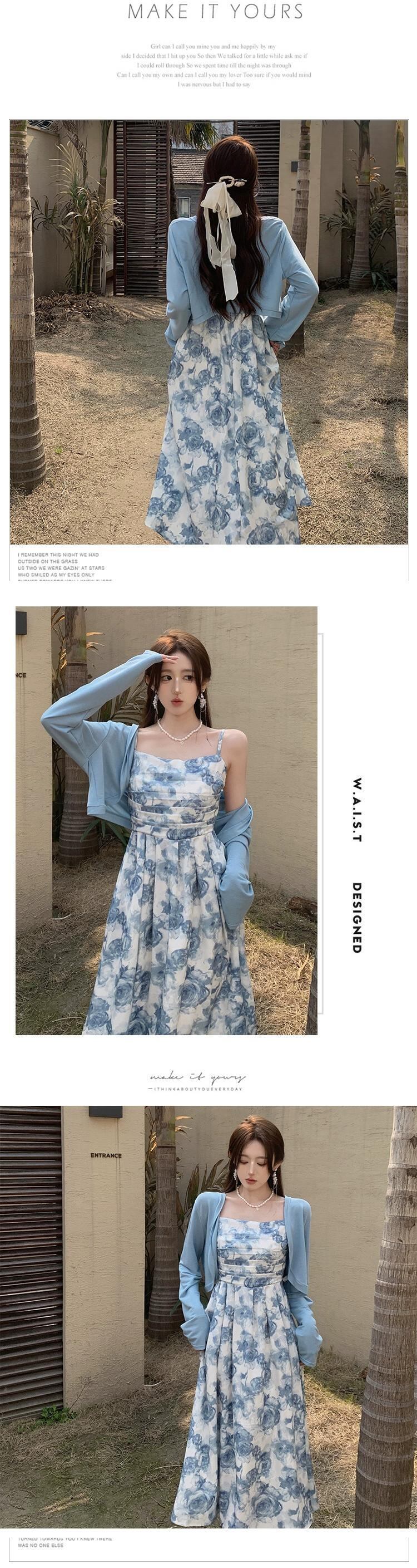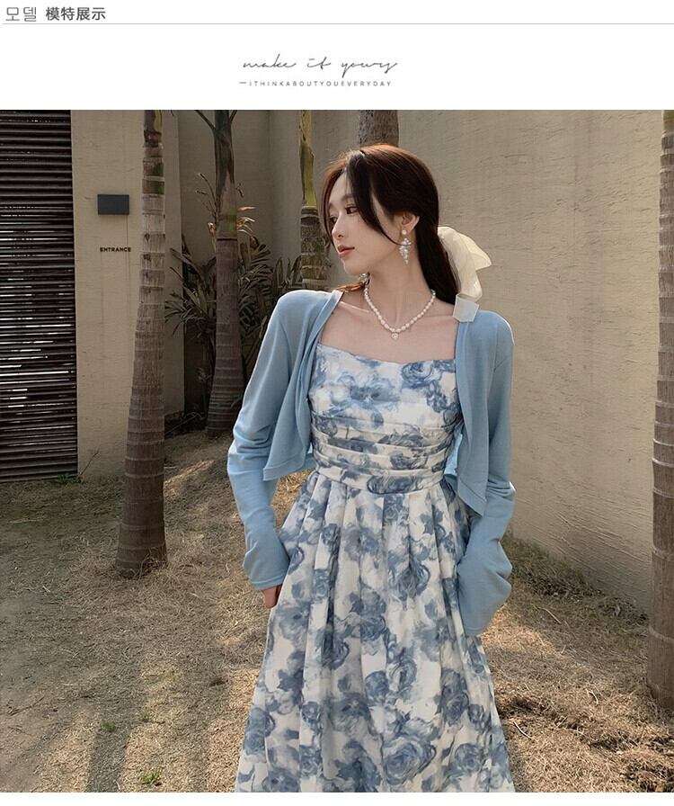 色:ブルーカーディガン,スリングドレス,ツーピースセット