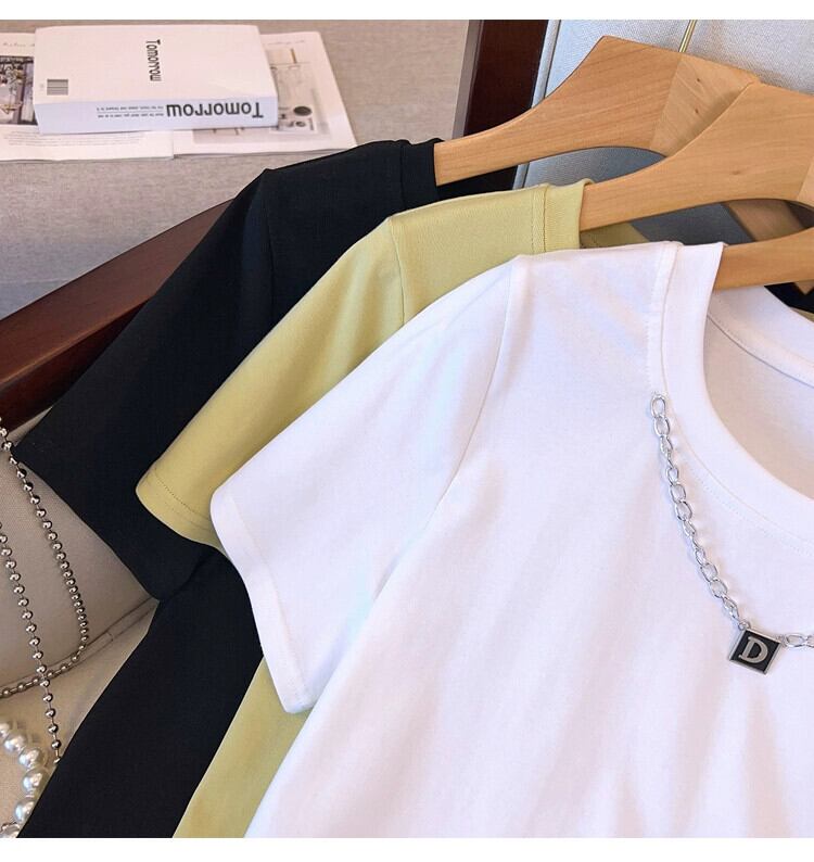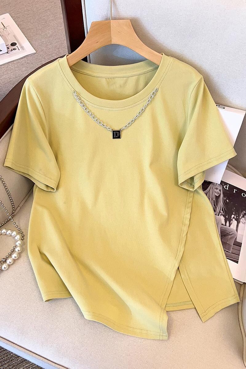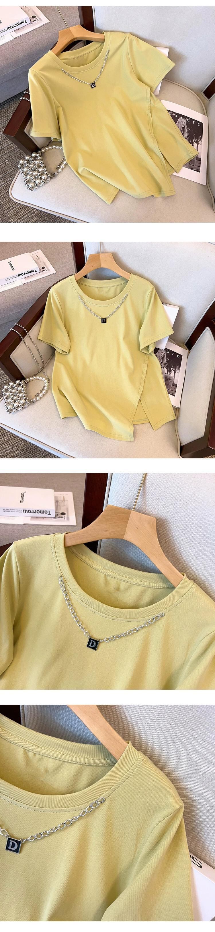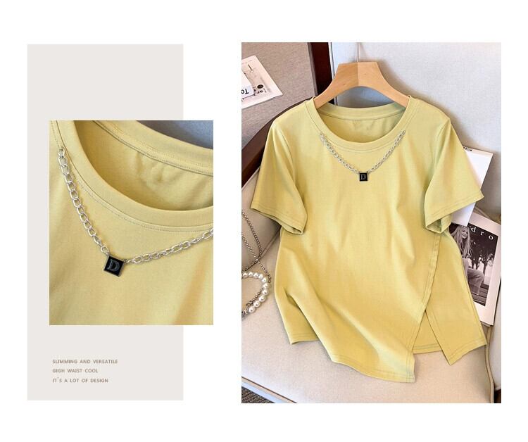 女性のファットシスター夏のファッションファッション細いチェーンカラー非対称スリット Tシャツデザインセンスカバーベリートップ サマー 夏物 8884121844544770