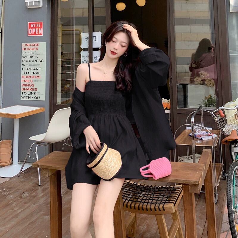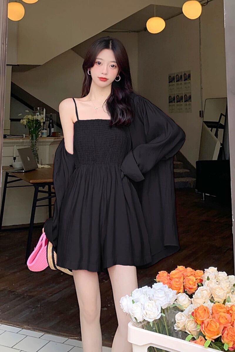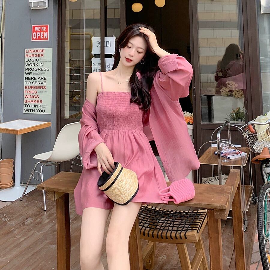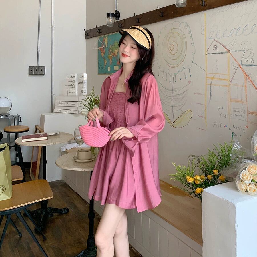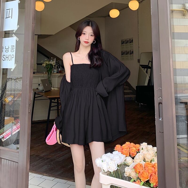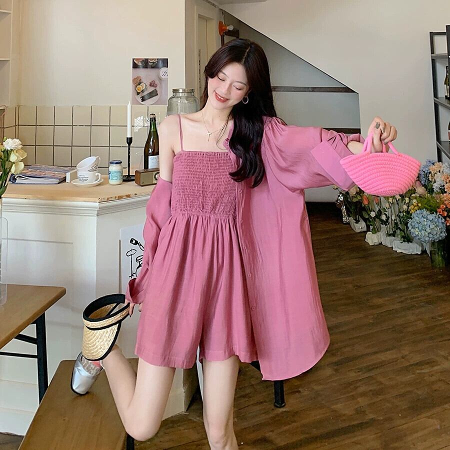 プラスサイズの婦人服 2023 流行の女性の春の新ファットシスターサスペンダーワンピースショーツ長袖日焼け止めシャツツーピーススーツ ロング 大きめサイズ スプリング 春物 ブルマー 8884176461124852